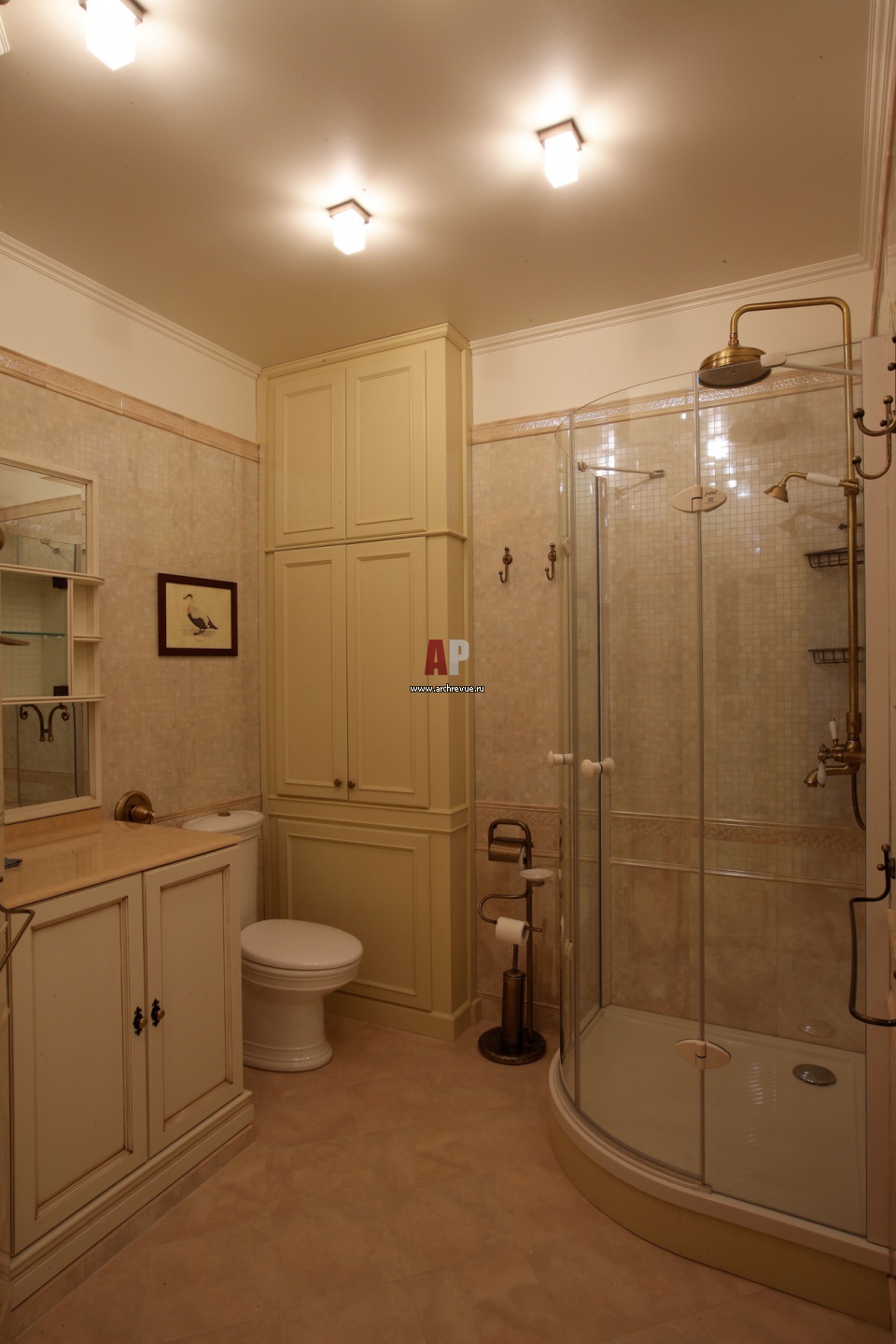 Гостевой санузел отделан мозаикой перламутрового цвета. На стенах – акварели с изображением птиц. Угловая душевая кабина, Hueppe.