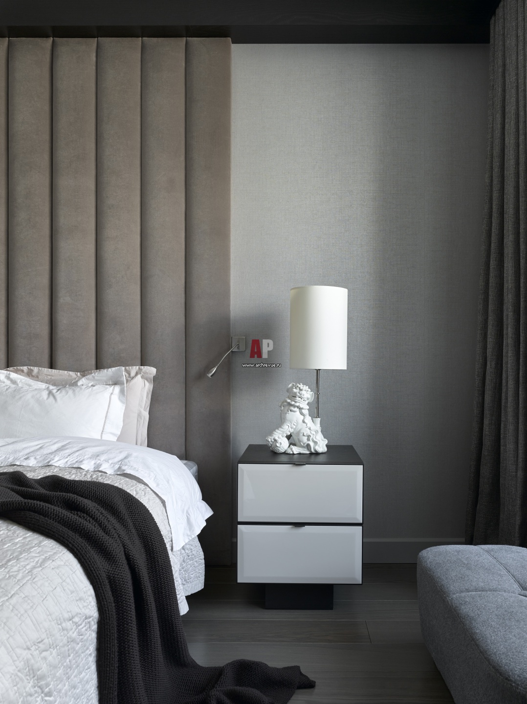 Спальня оформлена в серо-трюфельных тонах. Кровать с высоким текстильным изголовьем сделана на заказ. Прикроватные тумбы, Minotti.