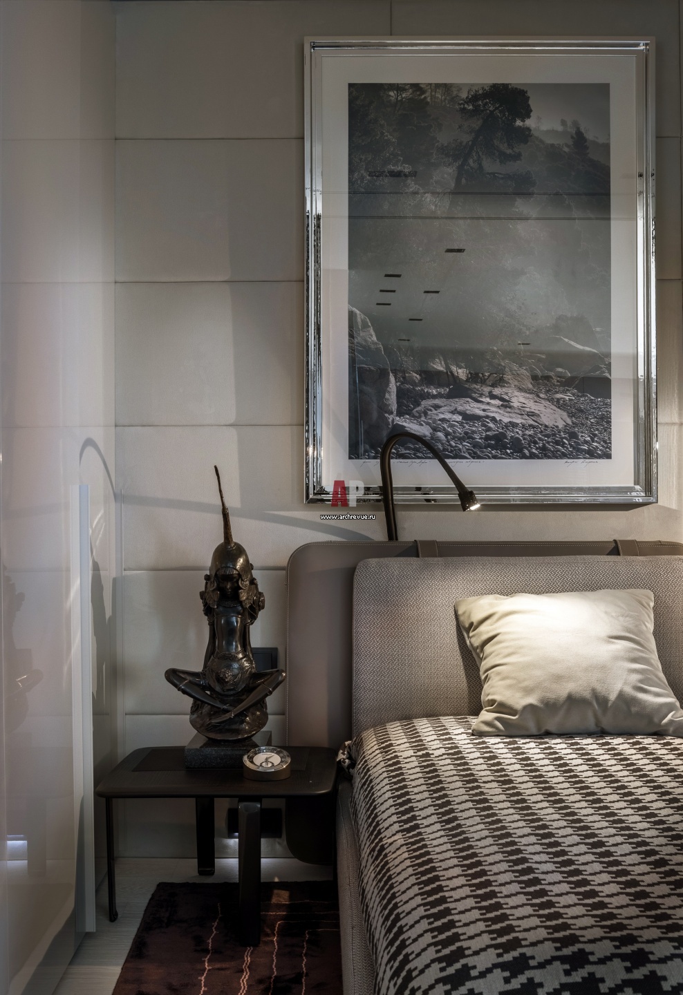 Стены спальни зашиты бежевыми панелями из натуральной замши.