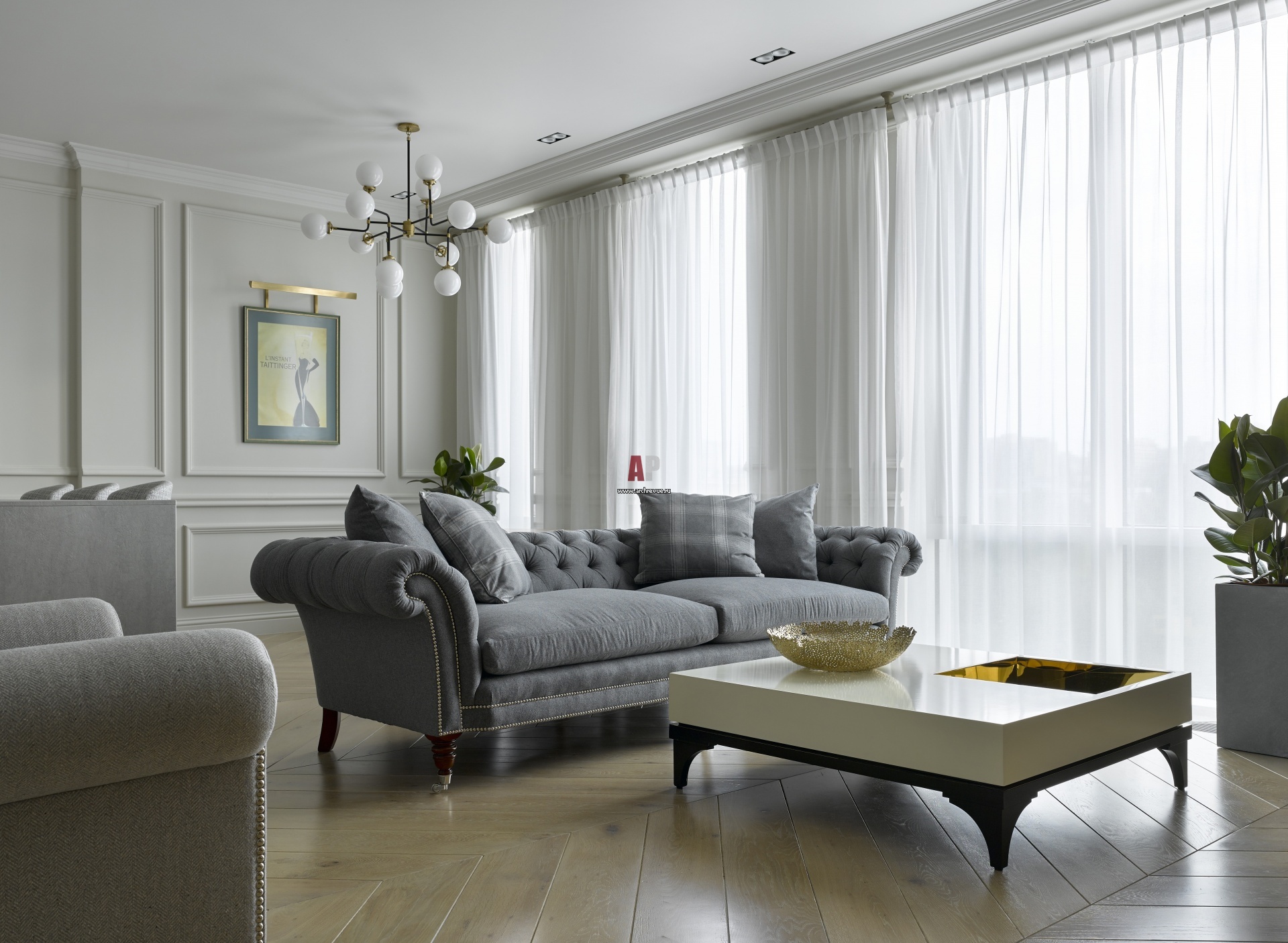 На полу гостиной – инженерная доска из светлого дуба под маслом, укладка гигантская «французская елка».