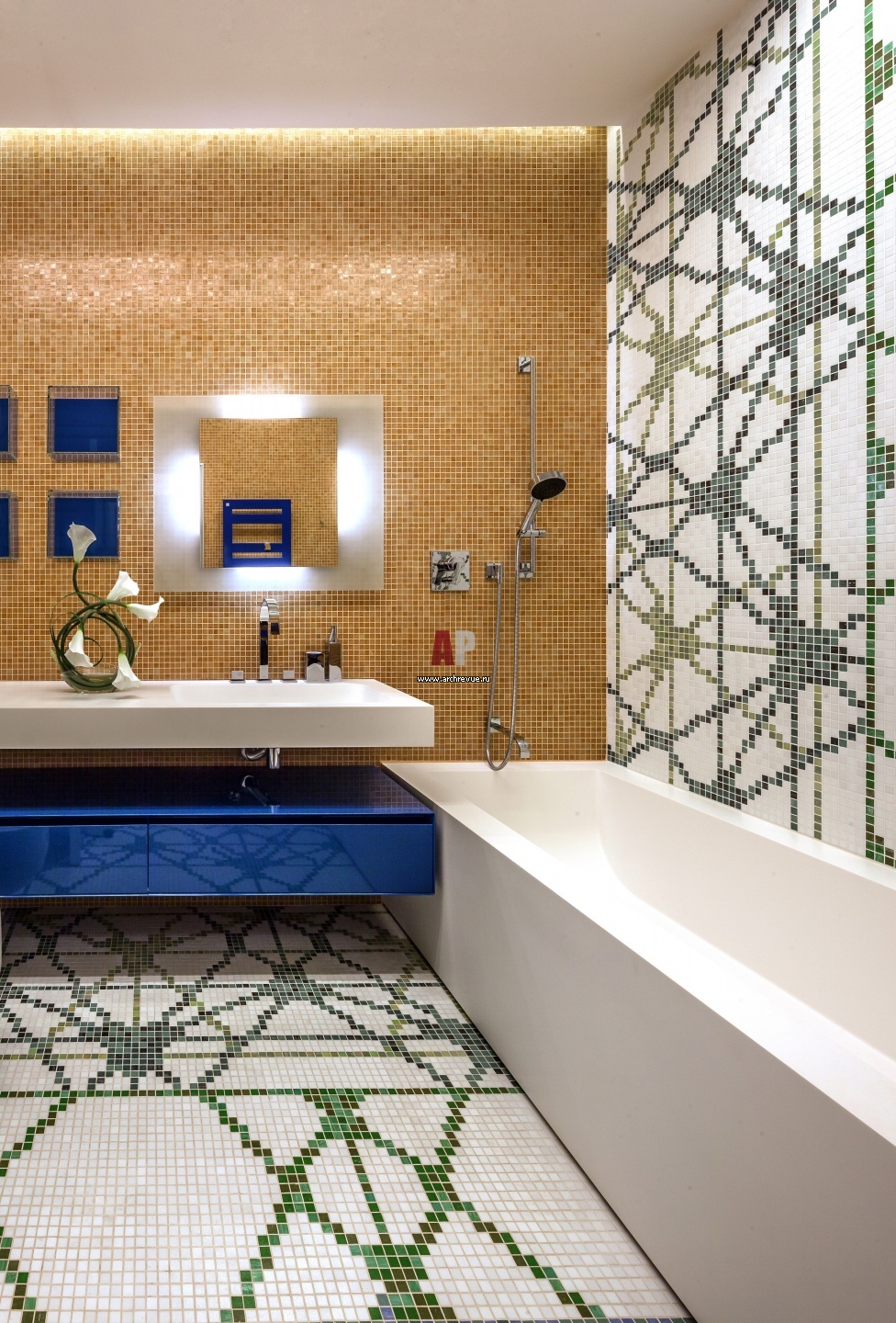 Интерьер детского санузла с мозаичной плиткой и синим умывальником.
