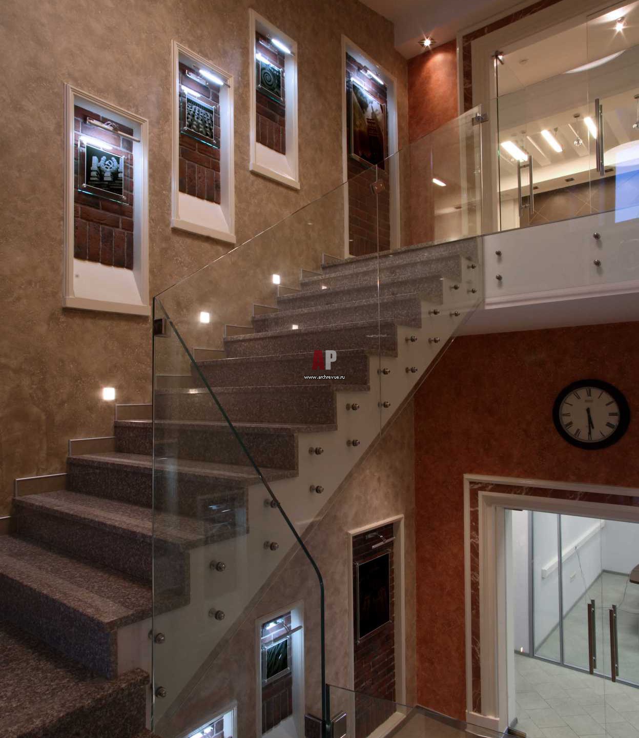 Особенно интересно решен лестничный холл. Чтобы задать пространству правильный ритм, замаскировать инженерные коммуникации и сделать интерьер запоминающимся, архитектор оформил стену нишами. Они имитируют заложенные кирпичом оконные и дверные проемы.
