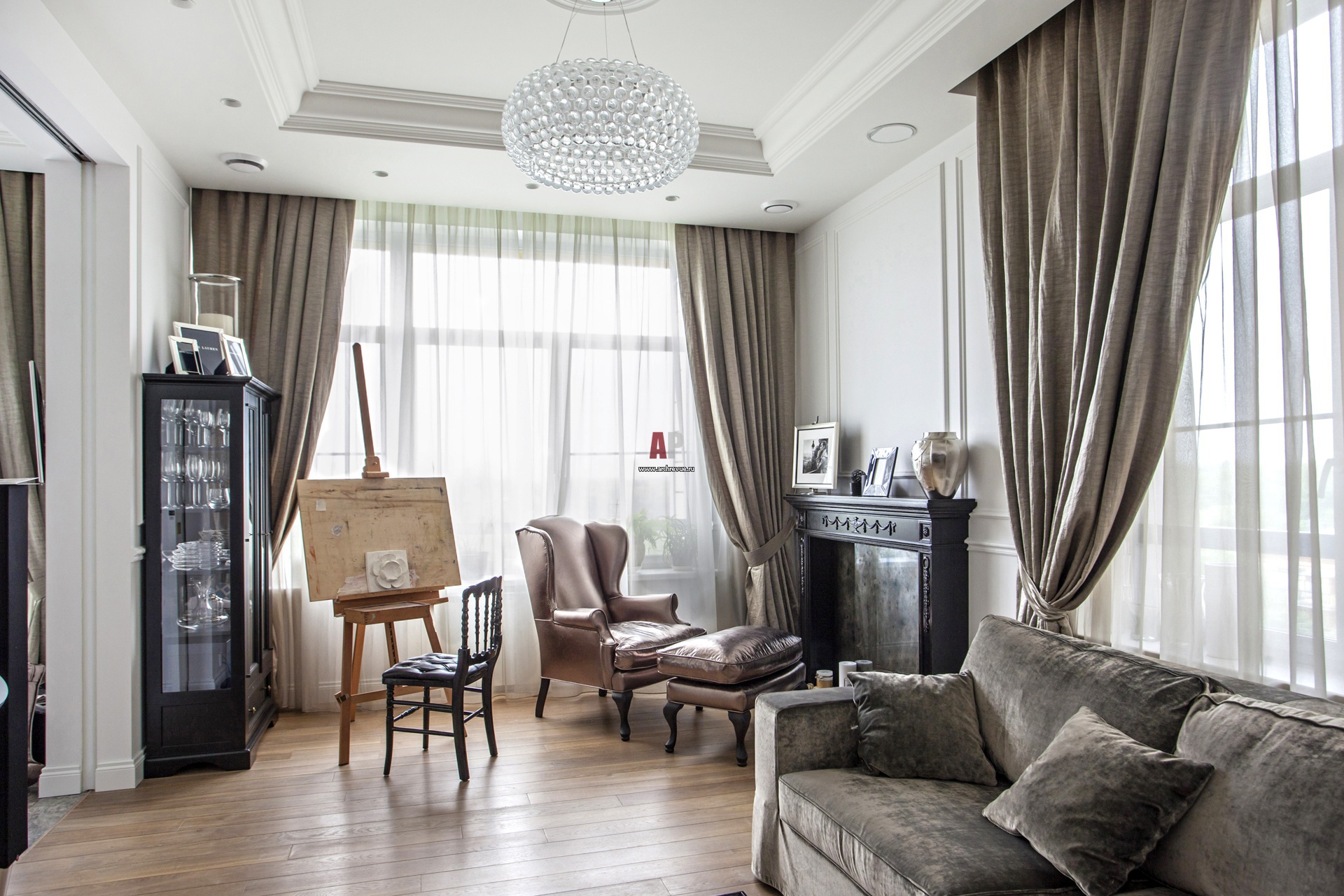 Уютная зона камина в гостиной. Портал из черного дерева в стиле французской неоклассики.