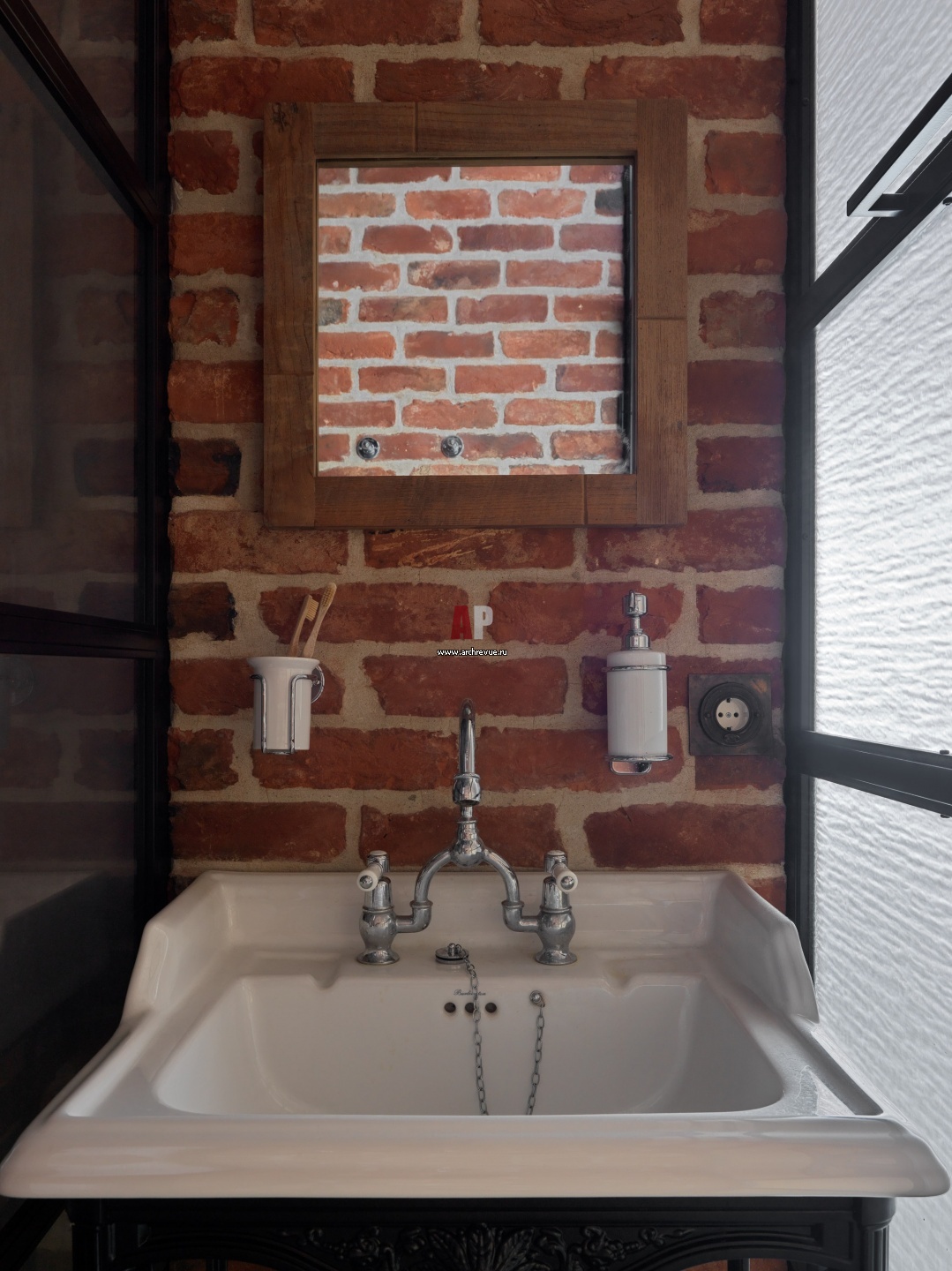 Санузел оформлен в стиле лофт. На стенах – плитка из старинного кирпича. Раковина, Burlington.