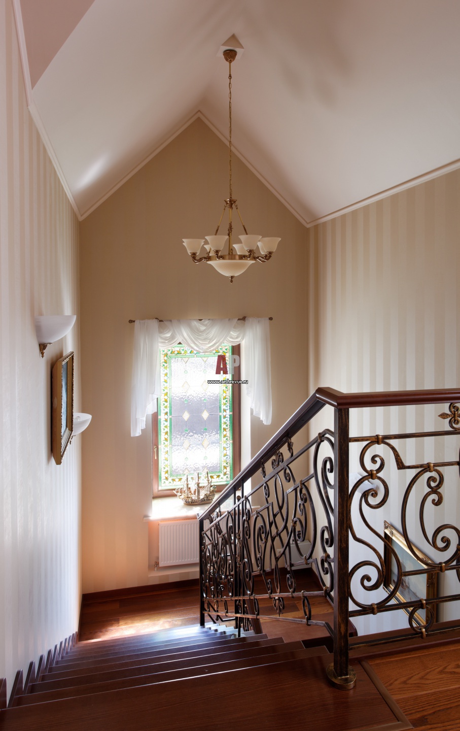 Лестничный холл выглядит нарядно благодаря ограждению из кованого металла с патиной и цветным витражам на окнах.