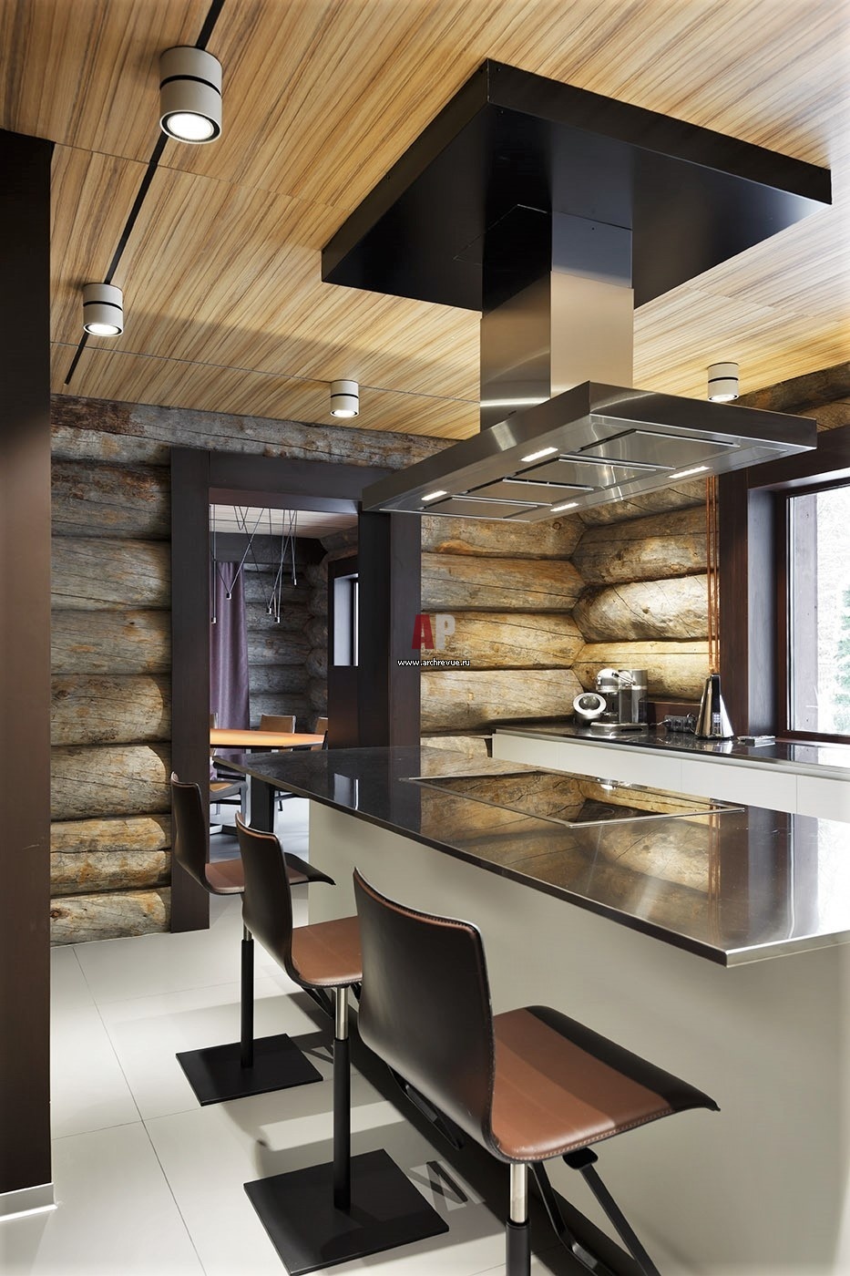 Современная кухня из нержавеющей стали вписана в интерьер дома из крупнокалиберного оцилиндрованного бревна Kelo диаметром 360 мм.