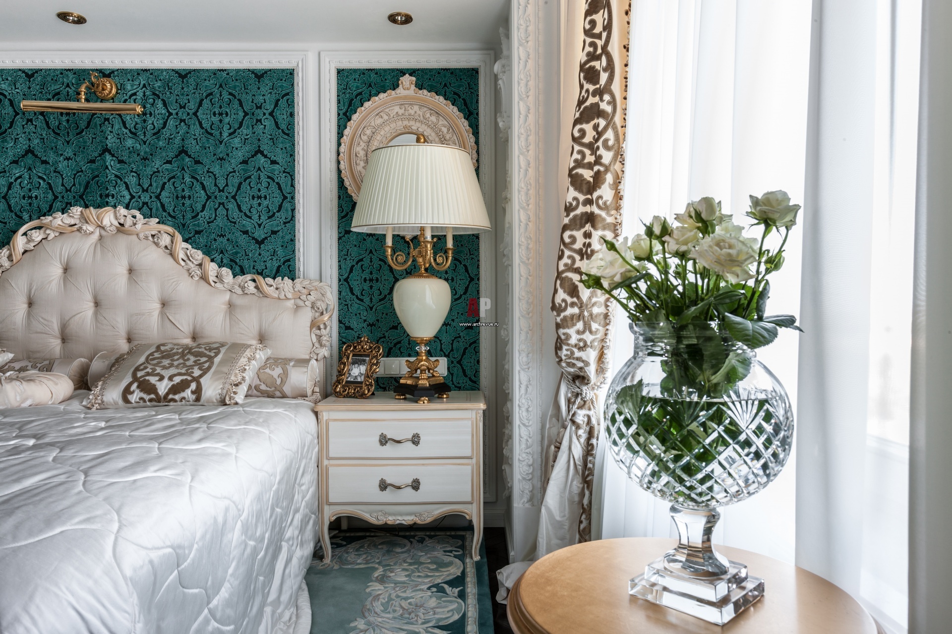 Интерьер бирюзовой спальни в стиле романтической классики. Бра, настольные ламы, Laudarte.