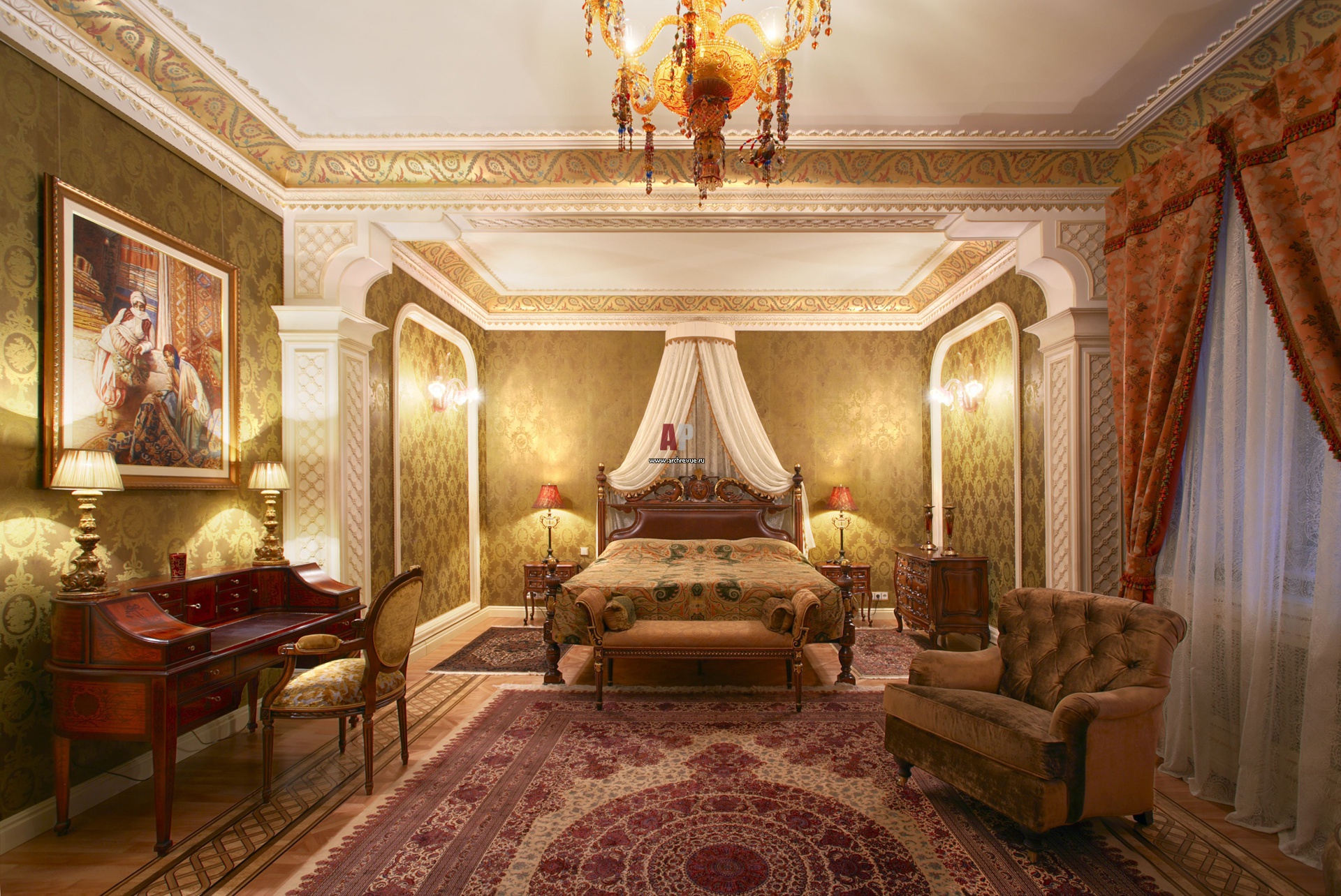 Хозяйская спальня с элементами этнического стиля. Мебель выполнена из массива дерева и стилизована под французскую классику. На потолке – ручная роспись сусальным золотом.