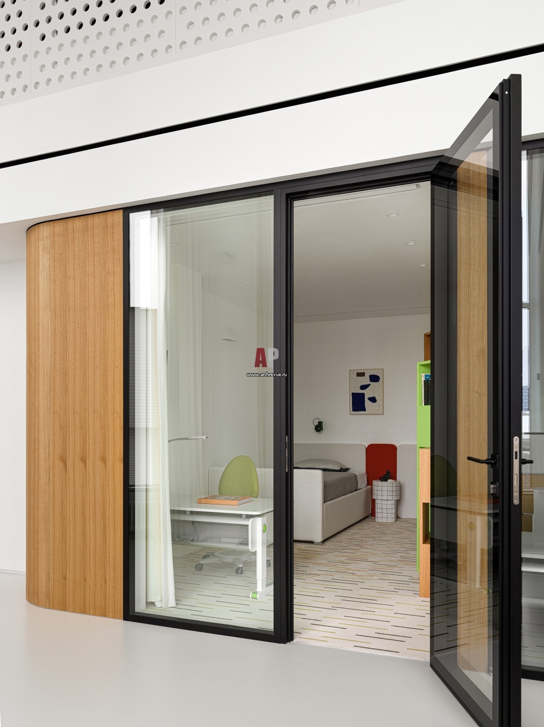 Детский блок выделен стеклянной перегородкой и стеновыми панелями из шпона.