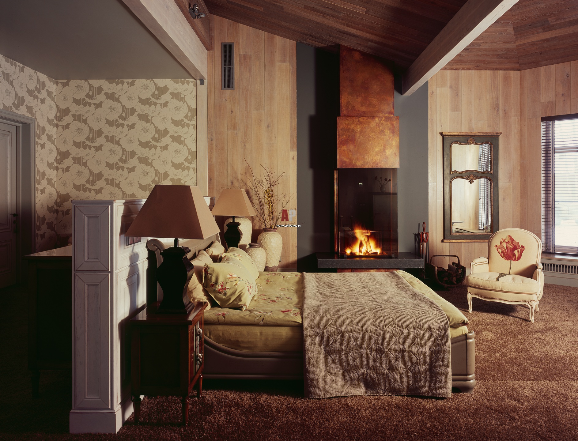 Спальня хозяев дома расположена на первом этаже. В отделках сочетаются два вида деревянных панелей и обои в крупный цветок. Деревянная стенка в изголовье кровати, обшитая буазери, сделана на заказ, изготовление «КД-Люкс ». Кровать Roche Bobois. Тумбочки Bizzotto. Настольные лампы Maison de Famille .