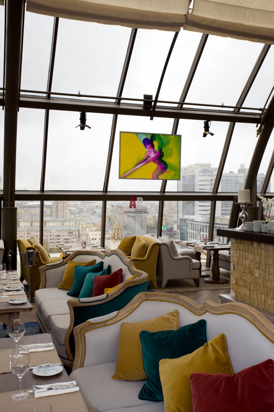 Мебель в классическом стиле создает необходимый комфорт в холодном окружении витражей. Расстановка мебели продумана таким образом, чтобы гости могли видеть Москву, встречать рассветы и провожать закаты не меняя расположения.
