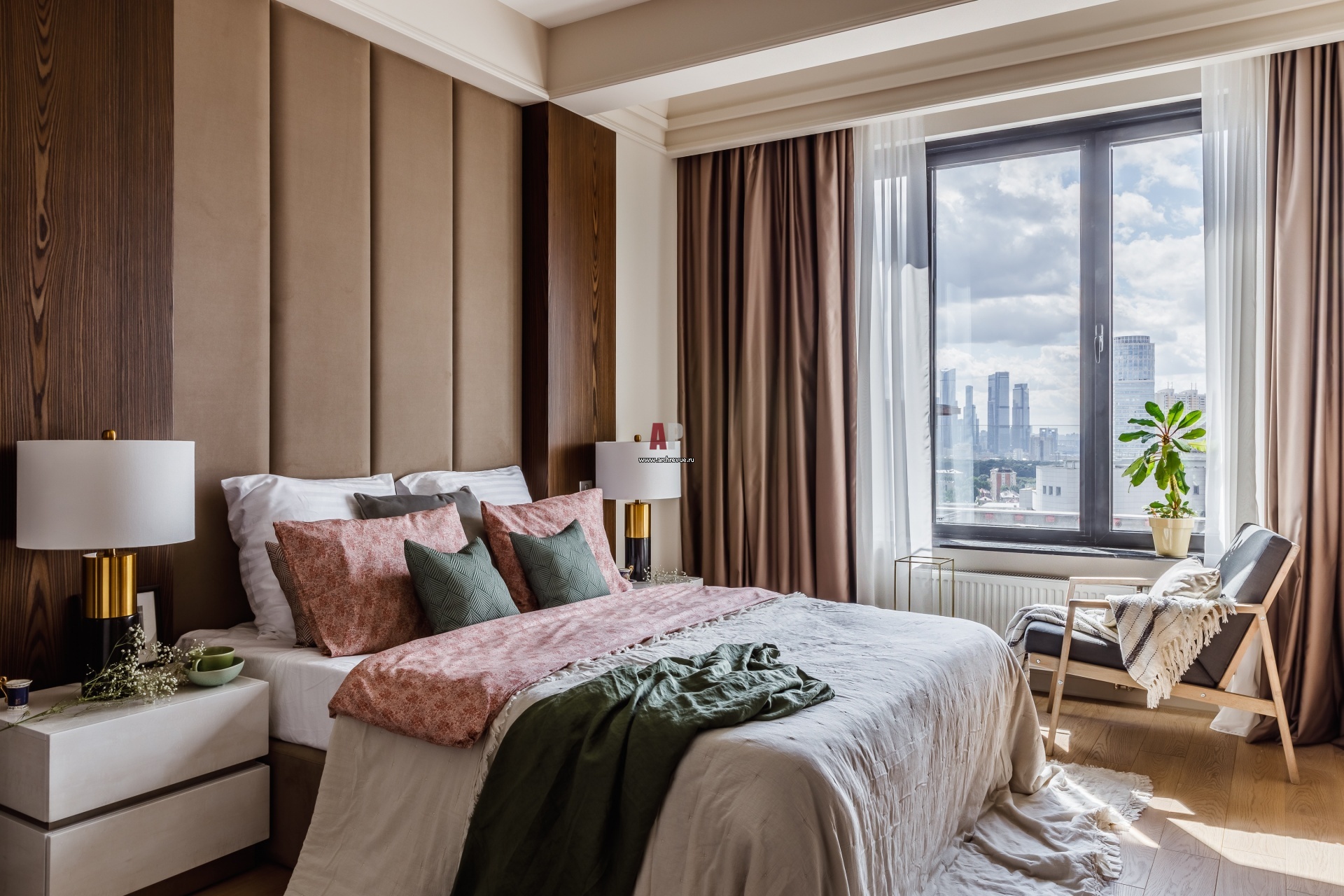 Стена за изголовьем кровати в спальне до потолка оформлена мягкими текстильными панелями в обрамлении шпоном ореха. Кресло, Dantone Home.