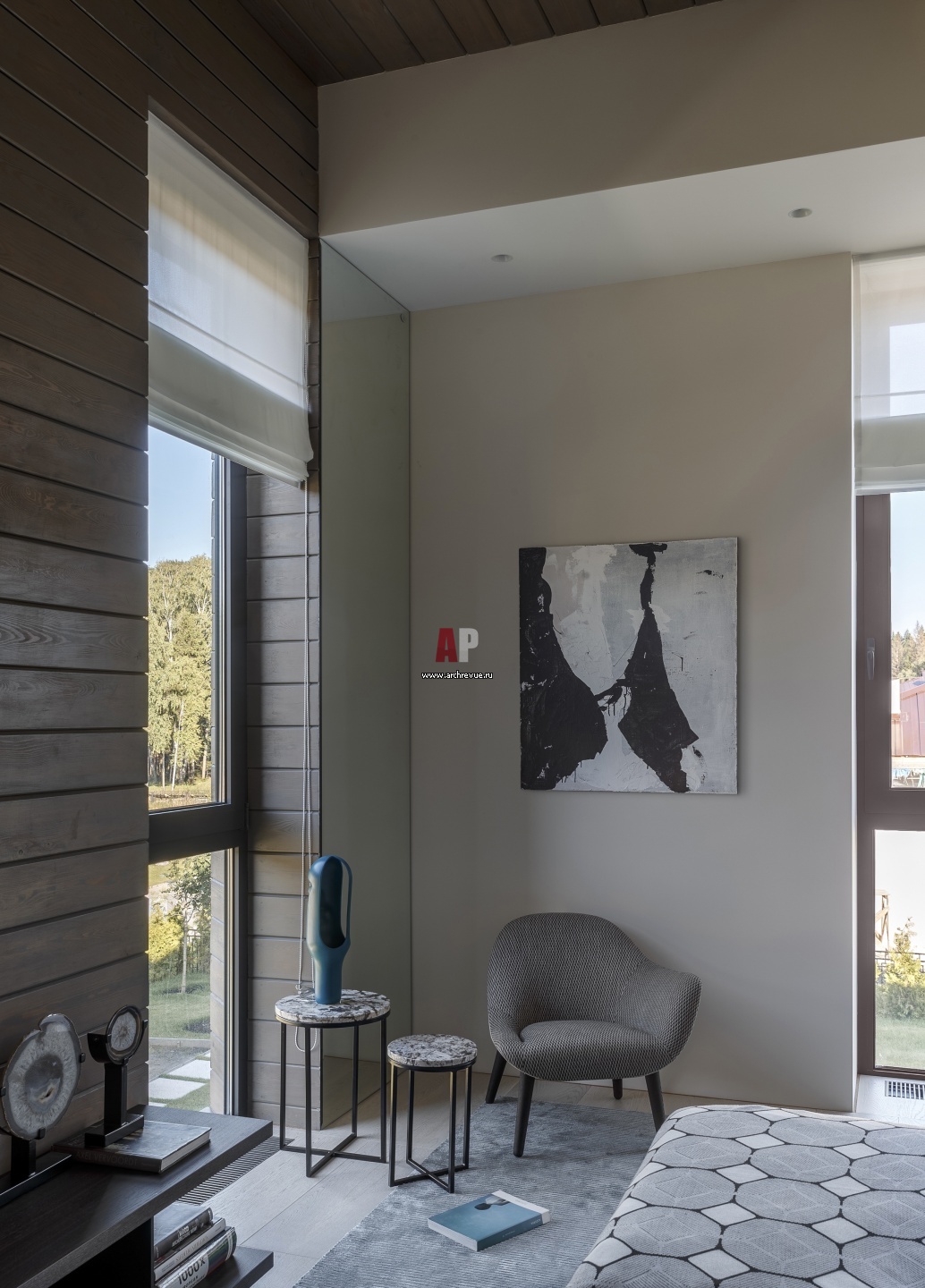 Одна из гостевых спален на втором этаже. Обшивка стен лиственницей дает ощущение тепла и жизни на природе. Аксессуары, винтаж.