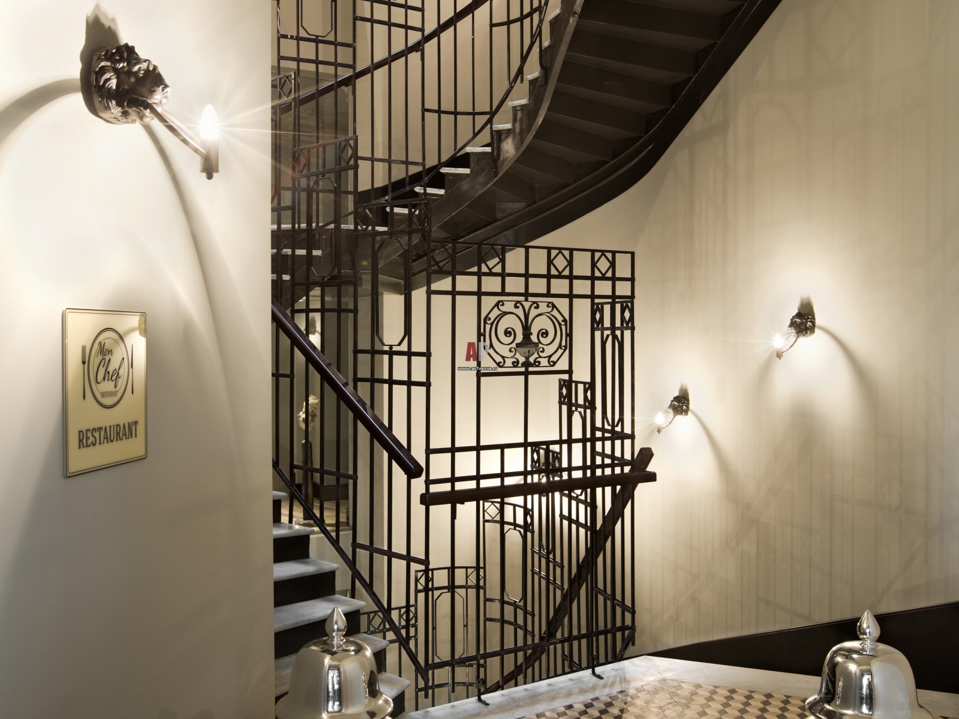 Дизайн лестницы с ограждением из черного кованого металла. На стенах – однотонная матовая краска нейтрального цвета.