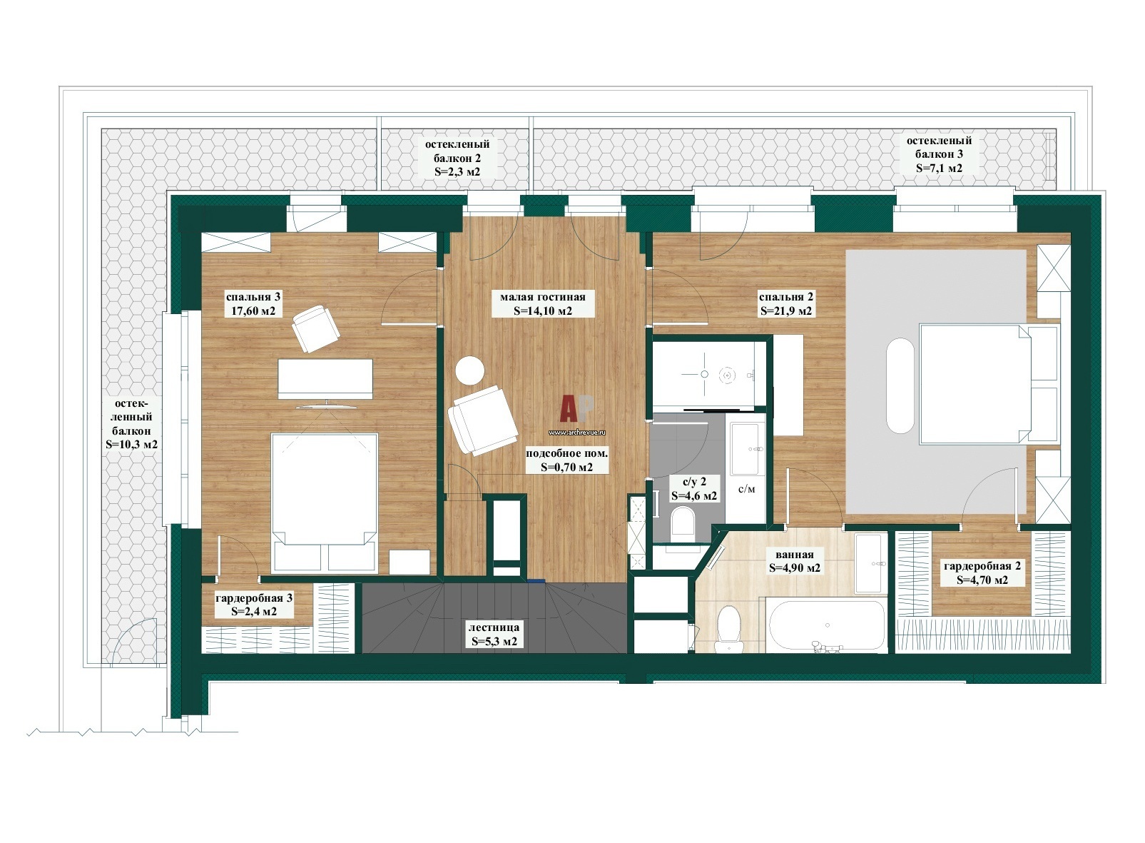 План второго этажа двухэтажной квартиры в монолитно-кирпичном доме. Общая площадь – 170 кв. м.