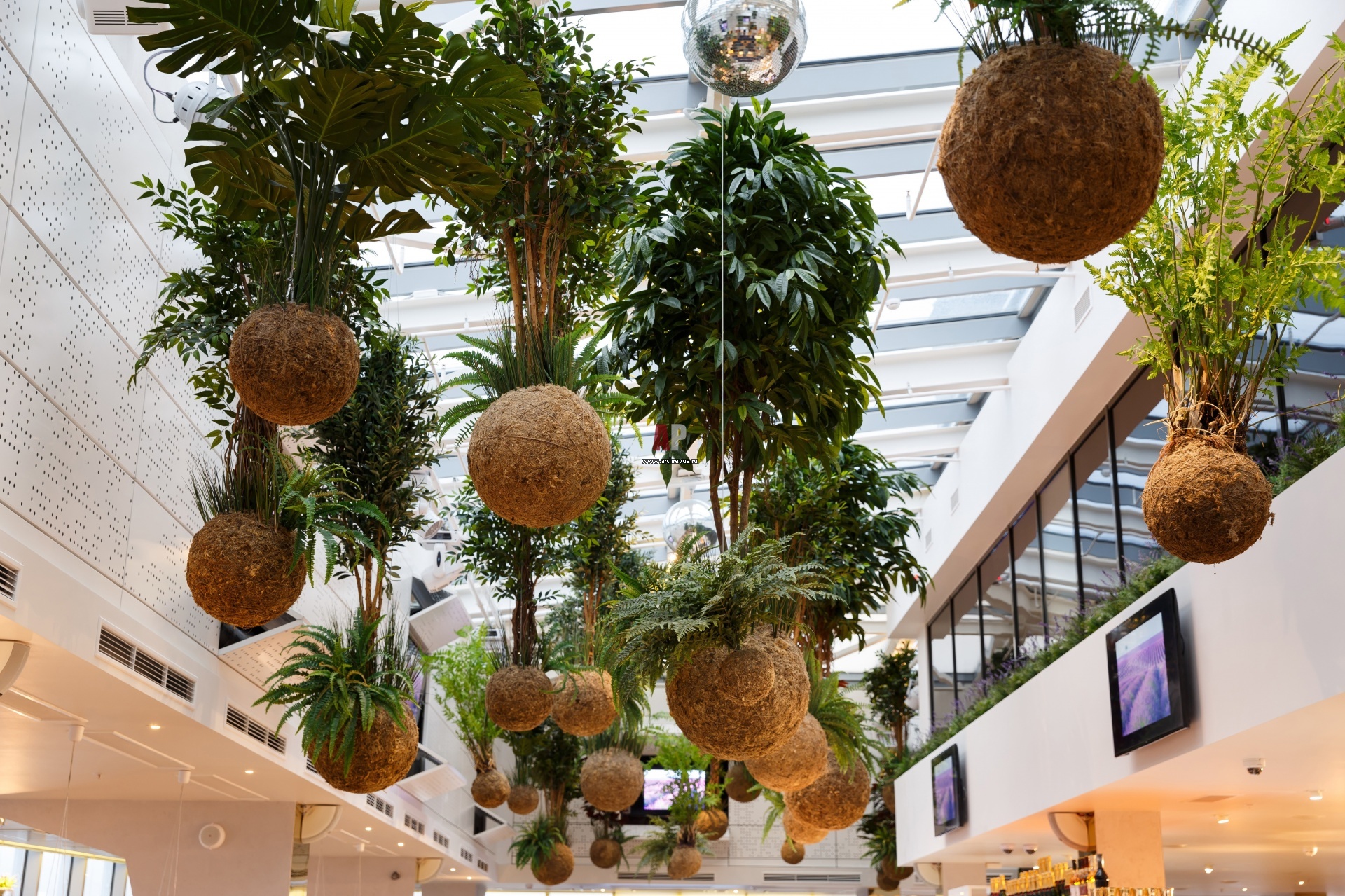 Атриум ресторана акцентирован висячими садами-кокедамами, парящими под потолком.