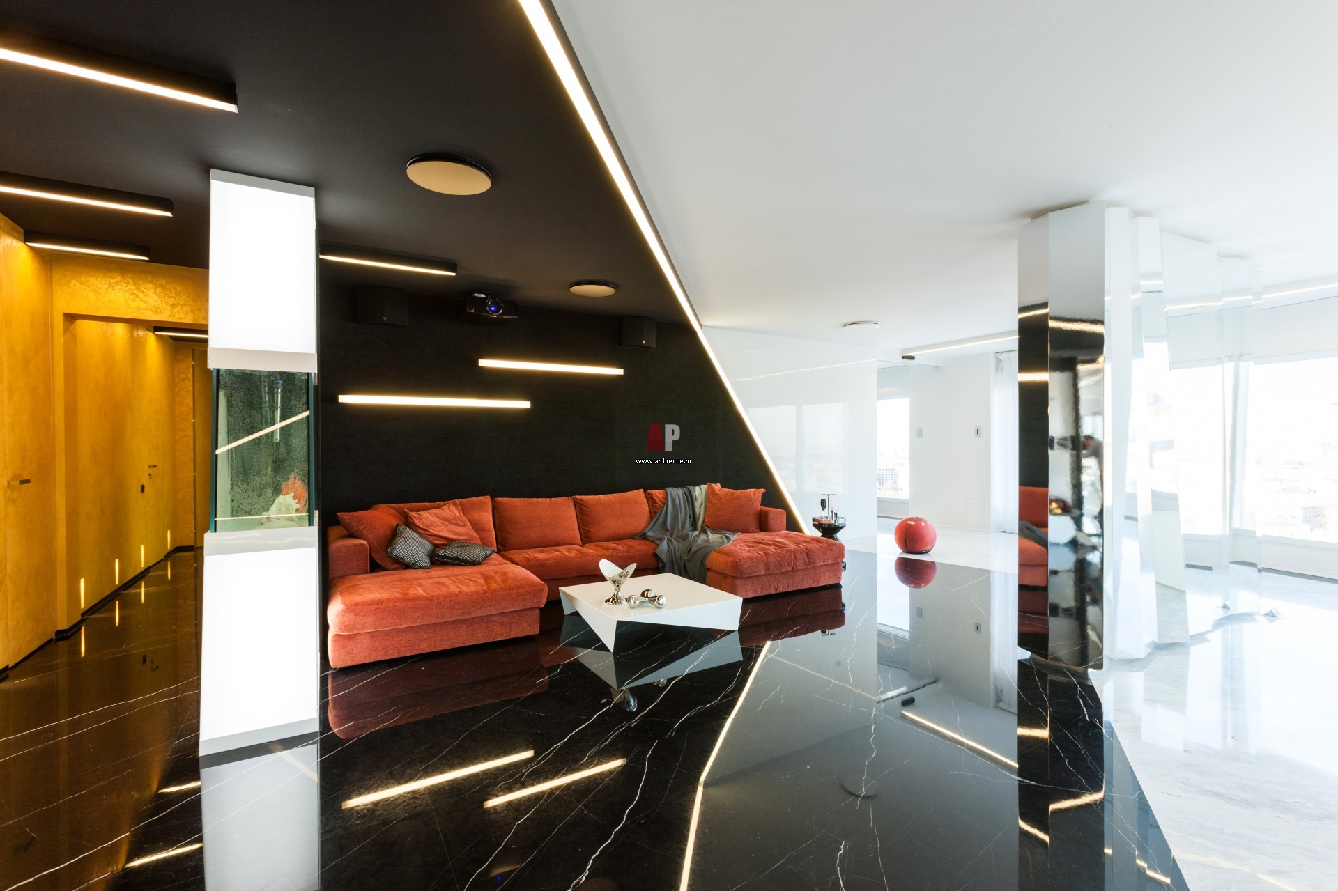 Коридор, рассекающий гостевое пространство, оформлен в охристо-золотом цвете, в светящуюся колонну встроен аквариум.