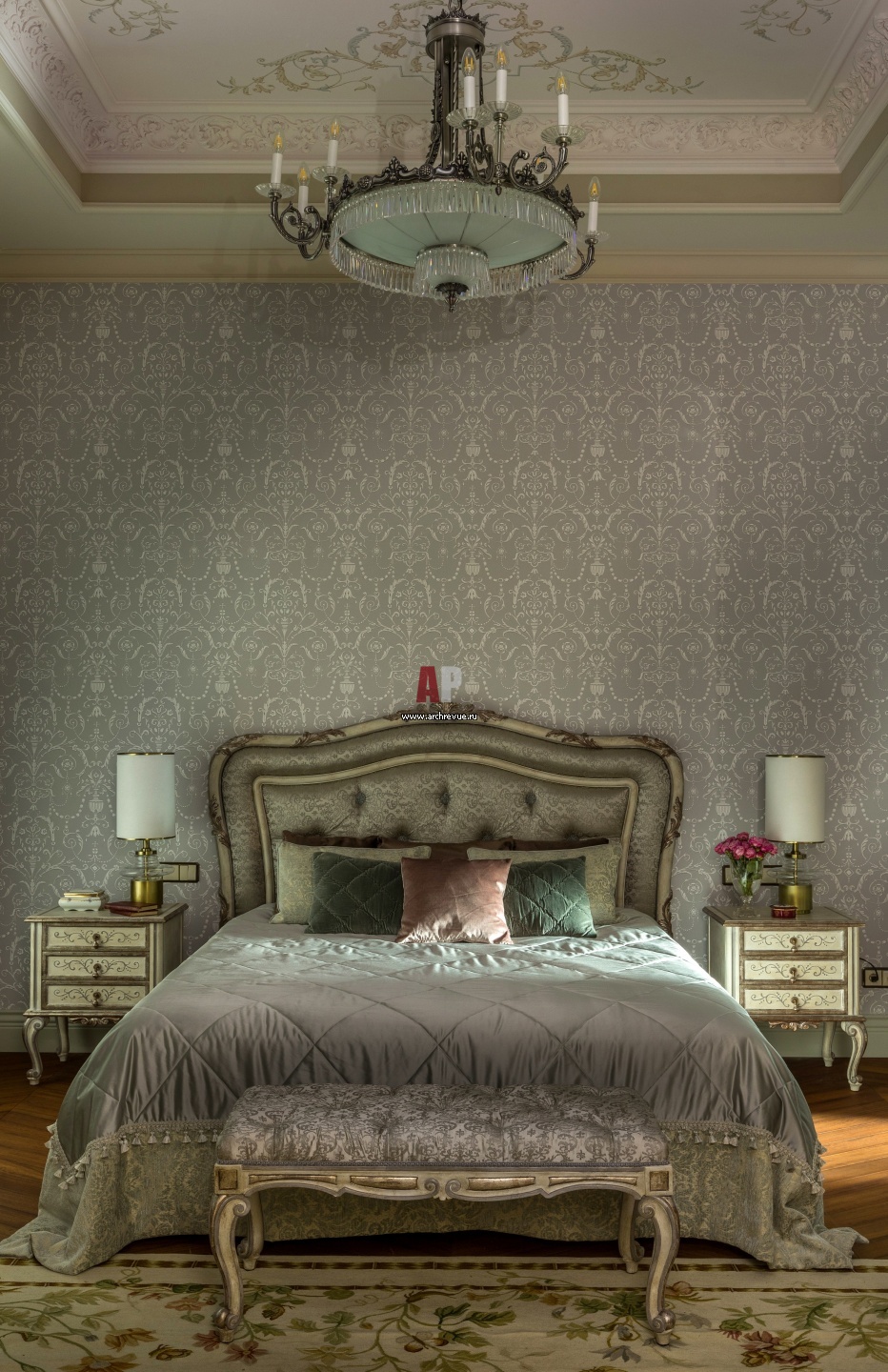 Хозяйская спальня выполнена в сером цвете. На стенах – обои с классическим рисунком, Cole & Son, коллекция Historic Royal Palaces. Лепные карнизы затонированы в теплый оттенок. Потолок украшен росписью, художник Полина Дроздова. Кровать, прикроватные тумбы, комоды, Silvano Grifoni.