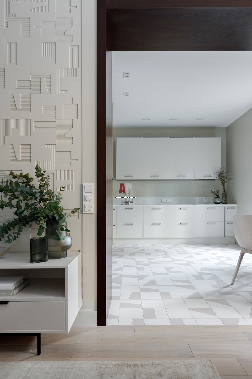 Широкий проем объединяет кухню и гостиную. Кухонная мебель распложена по двум стенам. Фасады шкафов выполнены в двух отделках: в лаконичном белом цвете и в шпоне дуба. Плитка на полу Estima нарезана и уложенная по авторскому чертежу.