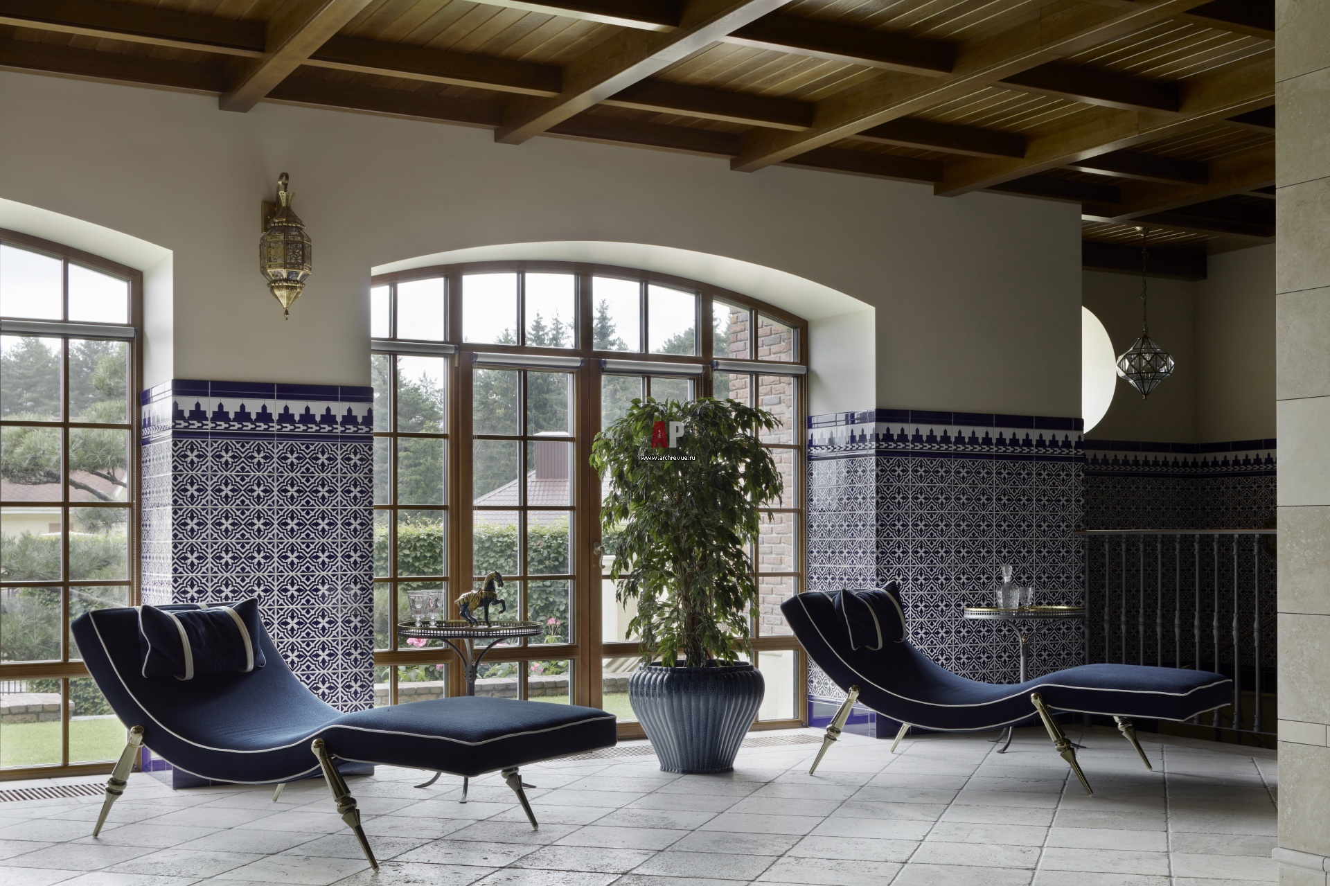Из зоны отдыха при бассейне есть выход на открытую террасу. Окна в доме дерево-алюминиевые.