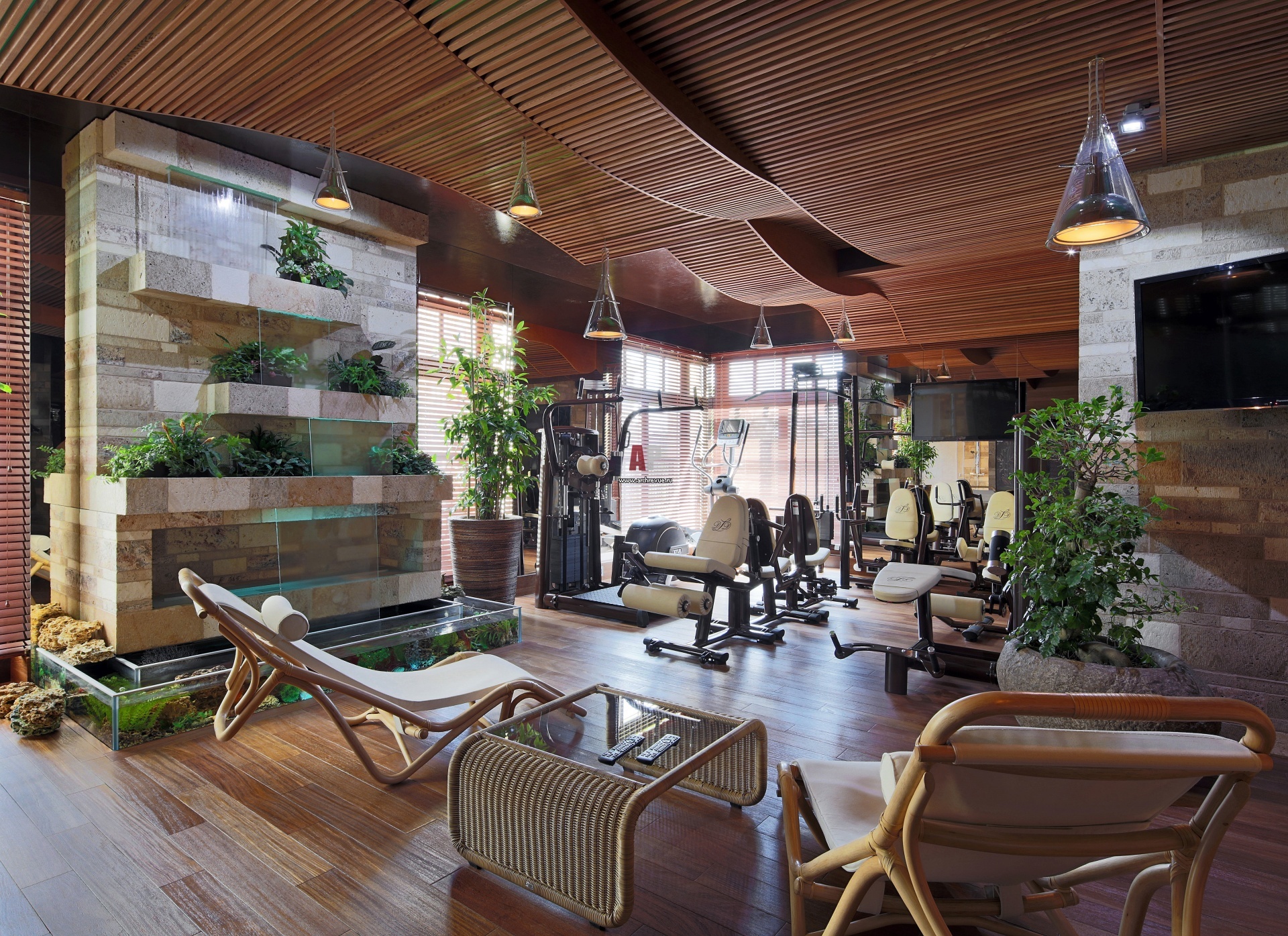Обширная СПА-зона в квартире оформлена в эко-стиле. Волнообразные реечные конструкции на потолке скрывают мощную систему вентиляции. Камин и каскадный водопад облицованы камнем.
