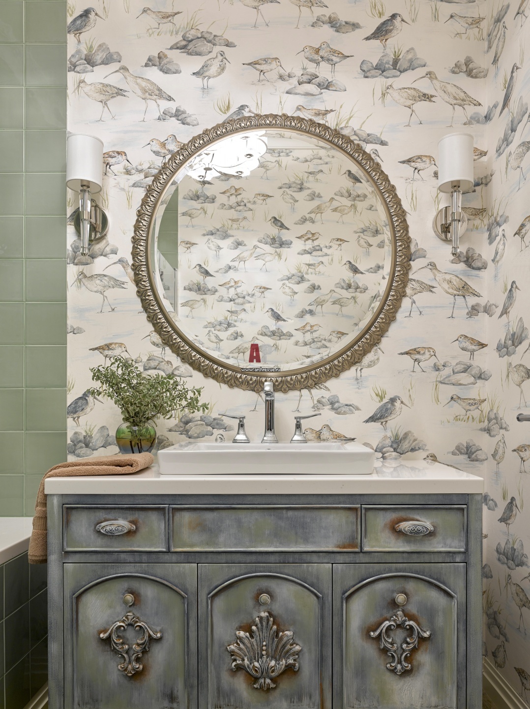 Санузел при одной из гостевых спален на втором этаже. За основу декоративной росписи с птицами взят рисунок классических английских обоев. Тумба под раковину, на заказ.