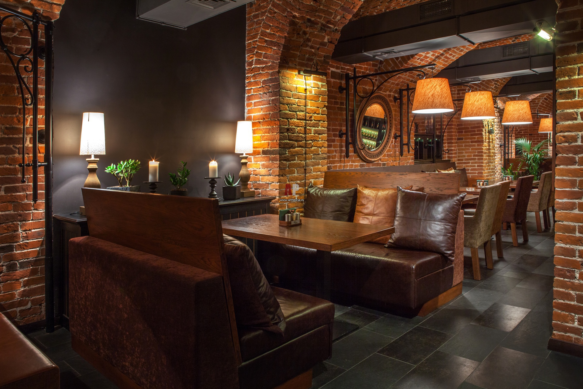 Интерьер зала ресторана. Стены из красного старинного кирпича. Кожаные диваны, Beni.