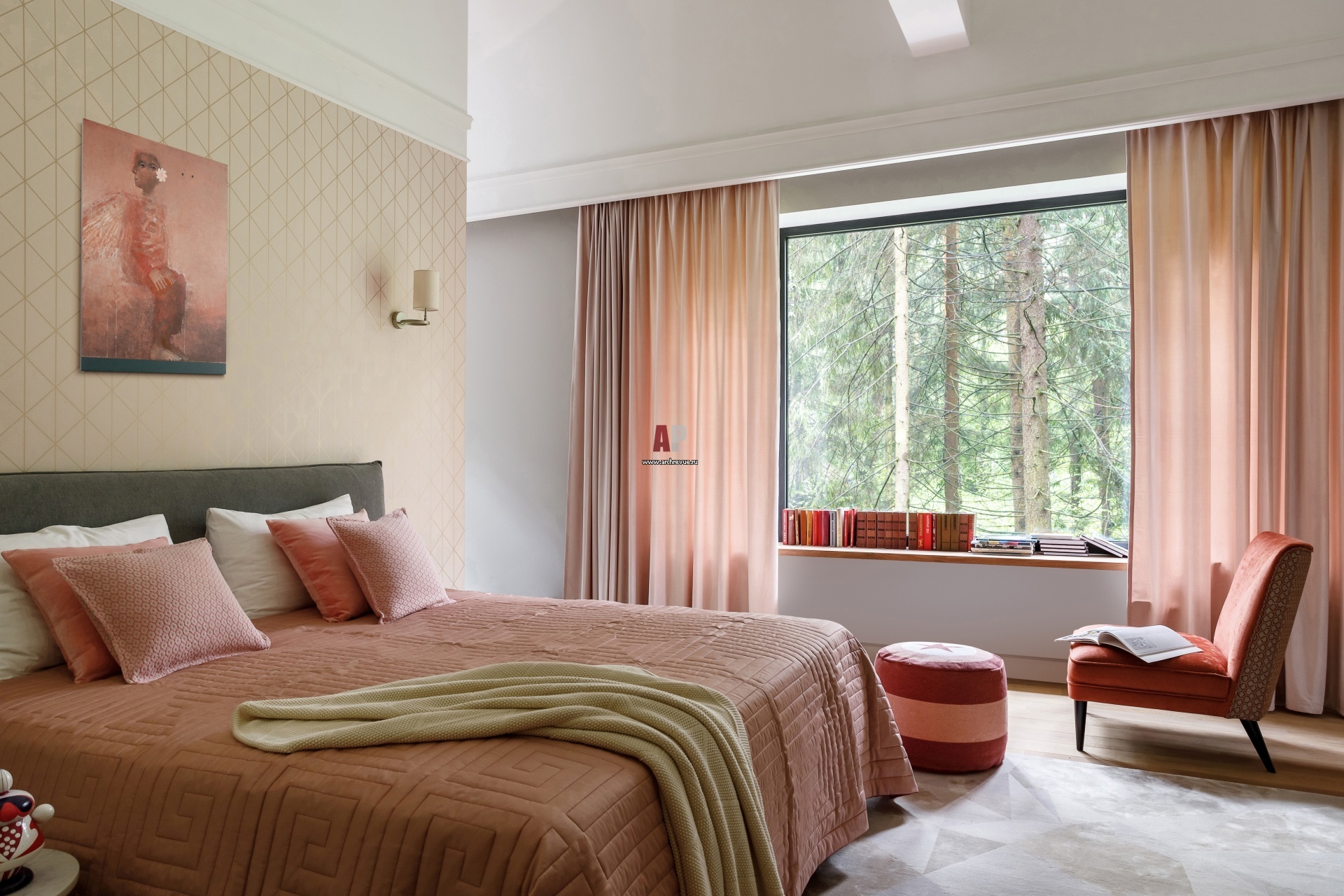 Девичья гостевая спальня. Стены: краска, Little Greene, оттенок French Grey 113 и обои, Engblad & Co, коллекция Graphic World. Портьеры, обивка мебели, покрывала и подушки нежного лососевого цвета. Кровать, Altrenotti. Столики, Zara Home. Кресло, Dantone Home. Керамическая кукла, керамист Елена Орехова. Картина работы Алексея Теренина.