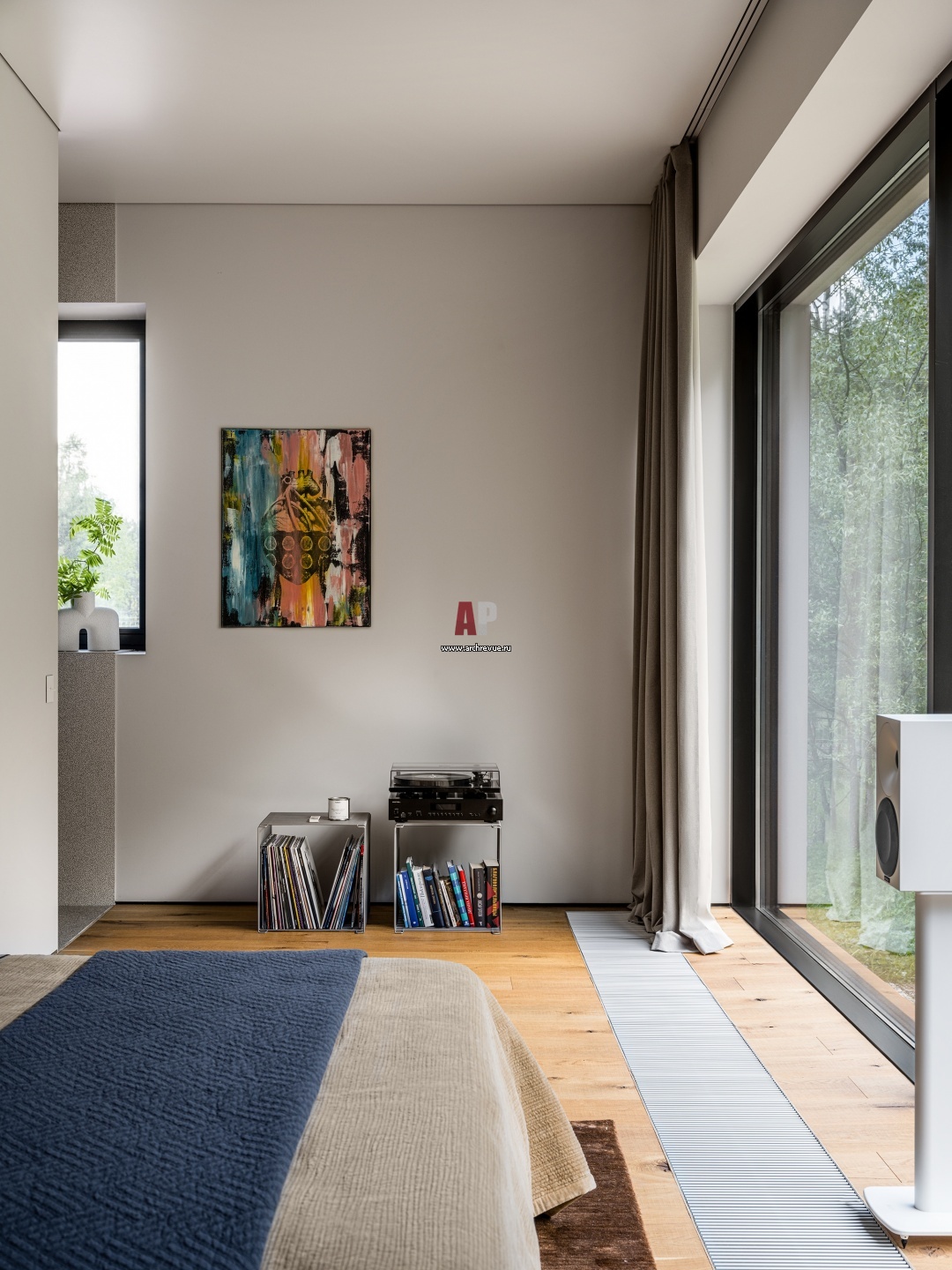На полу приватной части дома инженерная доска с натуральной текстурой: глубокими трещинами и сучками. По ней приятно ходить босиком.