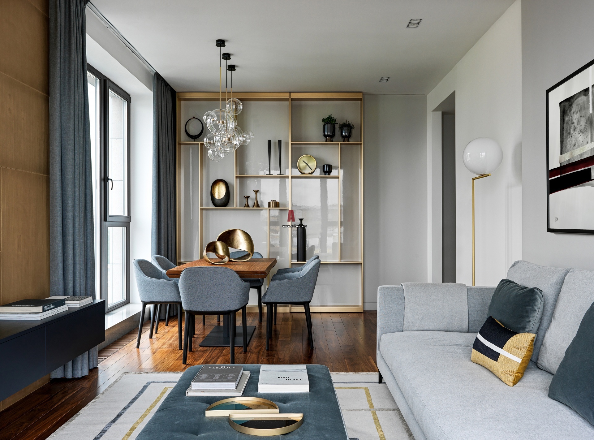 Современная квартира для молодой семьи, 101 кв. м. Интерьер гостиной-столовой в серой палитре с акцентами из латуни. На полу – доска из шпона ореха. Диван и банкета, Minotti, модель Andersen.
