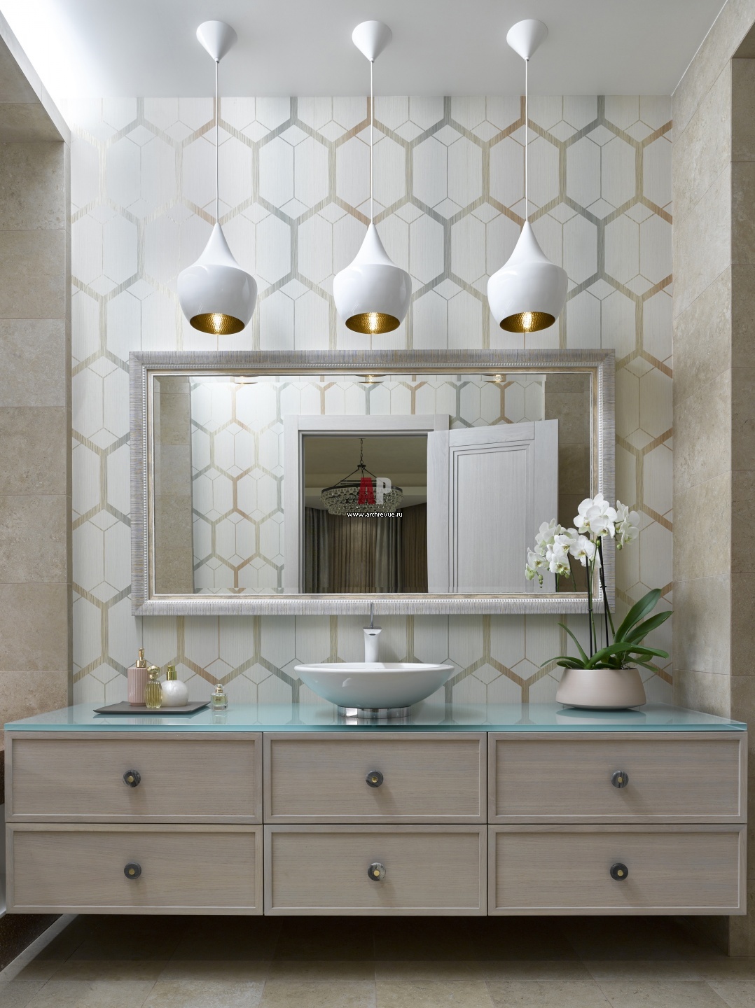 Хозяйская ванная комната выполнена в светлой палитре. На стенах и полу – керамогранит с фактурой травертина. Стена за умывальником оформлена обоями с золотым рисунком. Тумба под раковину сделана на заказ из дерева «седой дуб». Сантехника, Duravit. Смеситель, Axor. Светильники, Tom Dixon.
