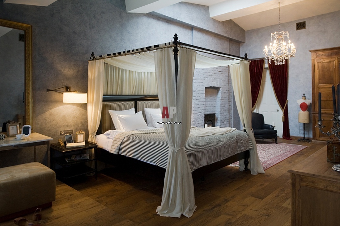 Хозяйская спальня в серых тонах. Центральный элемент - кровать с балдахином, конструкция из черного металла декорирована белой тканью. Потолочные балки выкрашены в белый цвет. Стены оформлены декоративной штукатуркой с эффектом бетона.