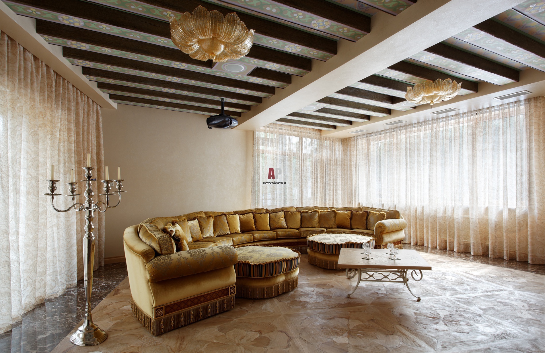 Домашний кинотеатр, который выполняет функции музыкальной комнаты, находится на первом этаже. Акустические динамики вмонтированы в потолочные декоративные панели. Полукруглый диван Old Java диаметром 520 см украшен 21 подушкой.
