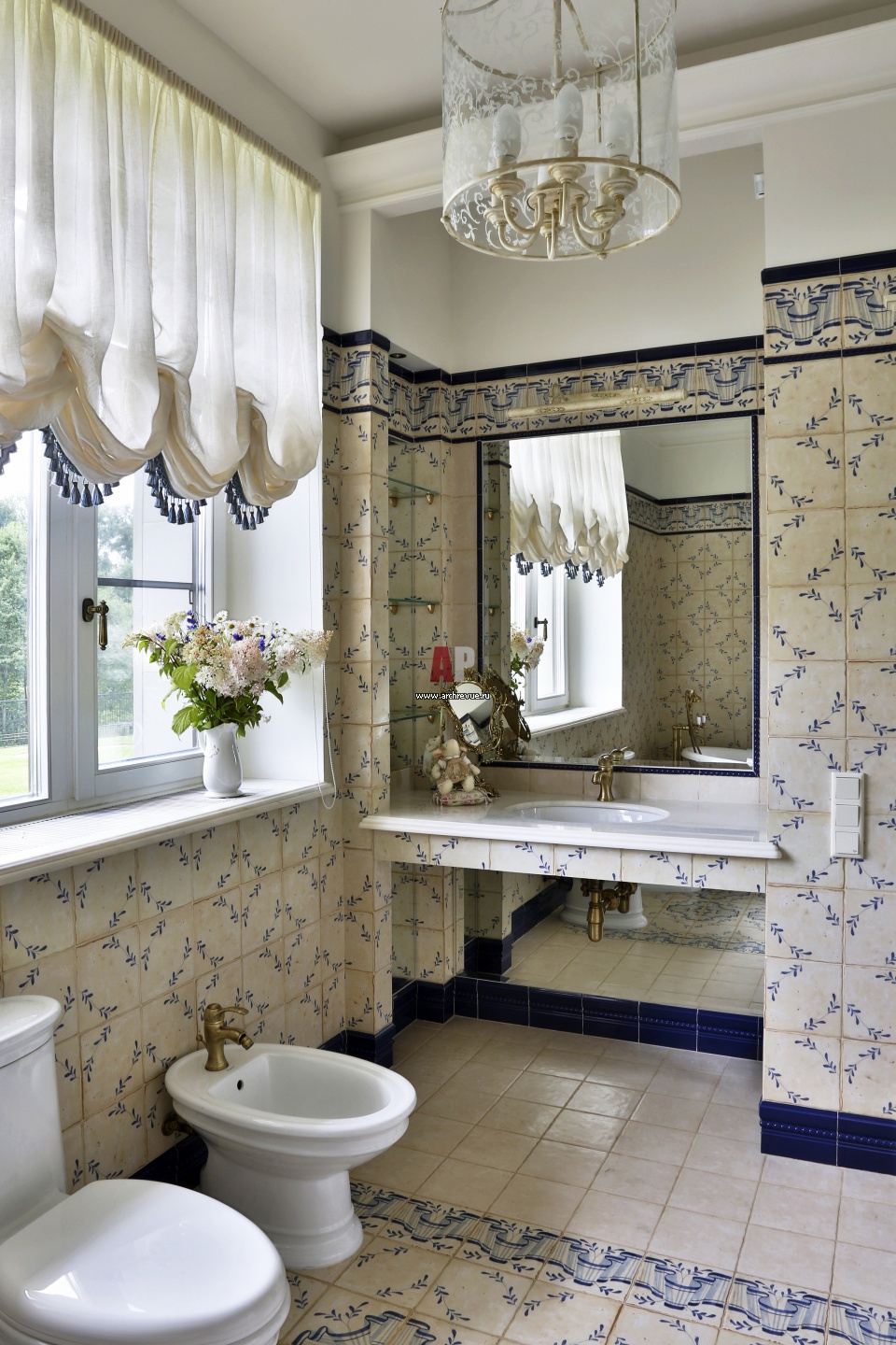 Интерьер ванной комнаты. Бежевая плитка с синим цветочным орнаментом в английском стиле. Раковина, унитаз, биде, Villeroy & Boch. Керамический плинтус насыщенного кобальтового цвета.