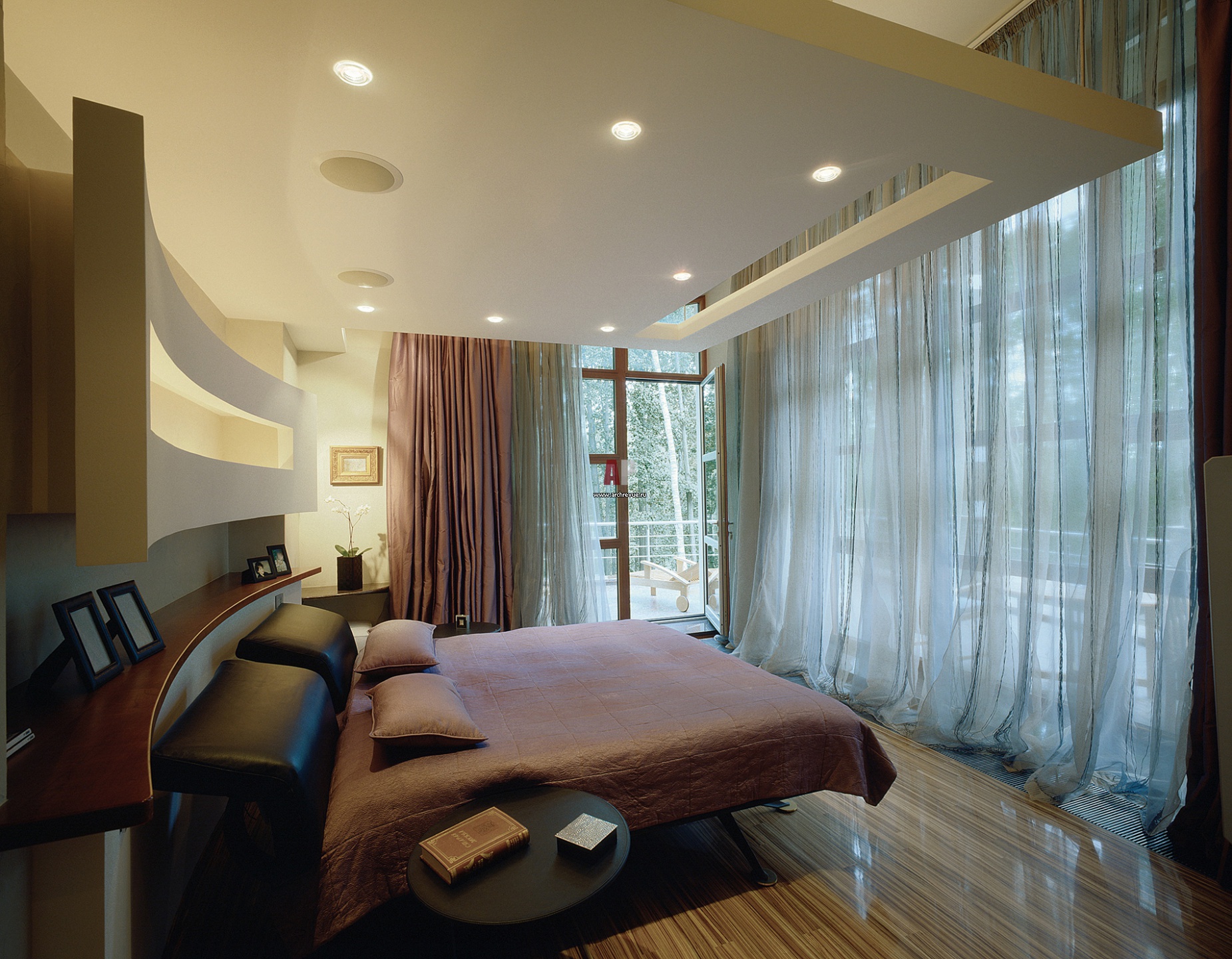 Хозяйская спальня в современном стиле с панорамным остеклением. Для обогрева помещений разработана система с применением комбинированных схем отопления с принудительным обдувом.