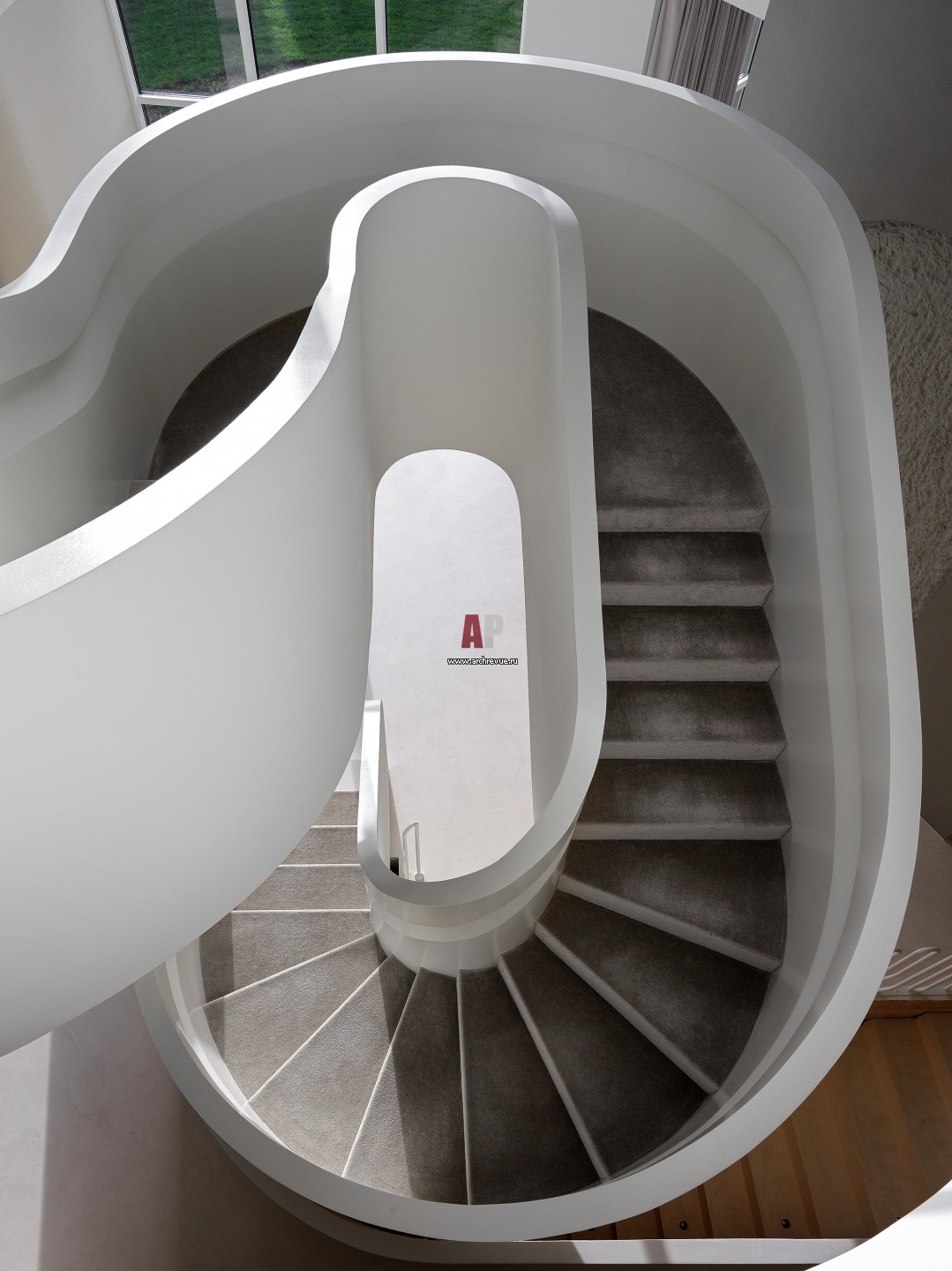 Спираль лестницы выводилась вручную на месте. Такой сложный абрис не получить математическими расчетами, с ней пришлось работать как со скульптурой.