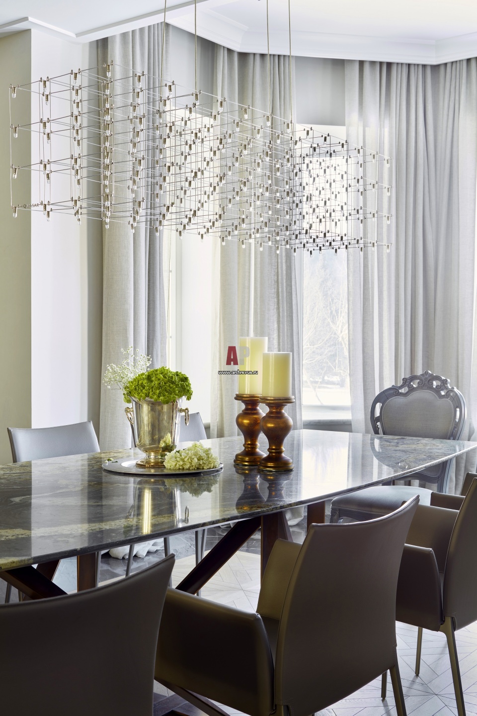 Интерьер столовой. Обеденный стол выполнен по индивидуальному заказу, ножки – медь, столешница – из цельного слэба гранита. Светильник-паутинка, Quasar.