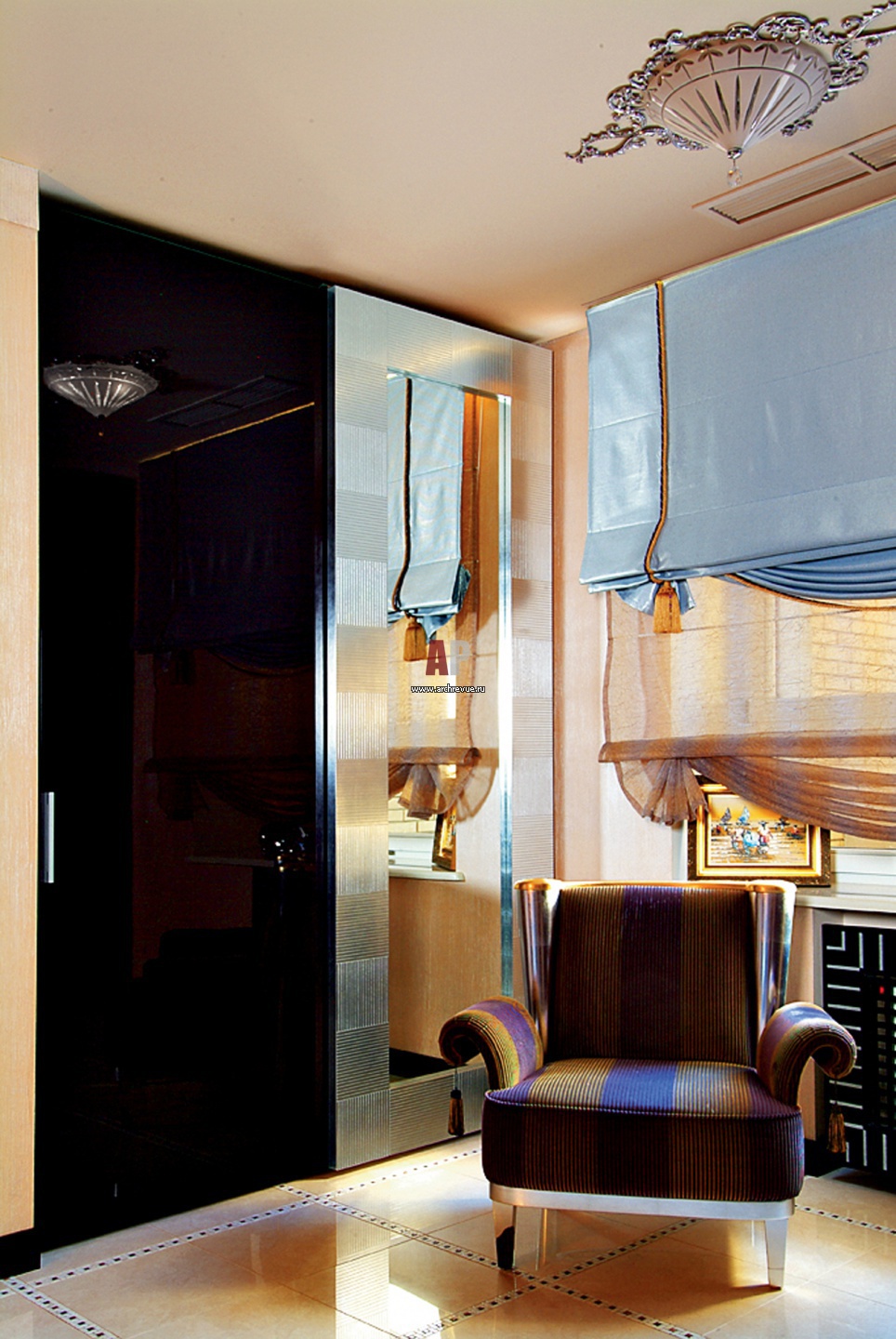 Интерьер прихожей. Окно задрапировано тонкой парчой. Рядом с высоким черным лакированным шкафом и зеркалом в полный рост – необарочное кресло с серебристыми ножками.