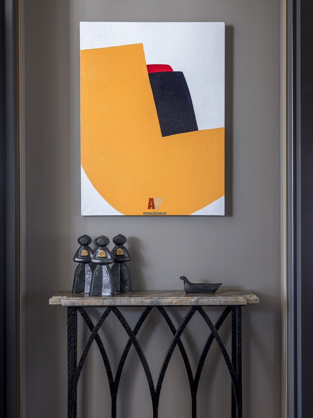 Консоль с кованым арочным основанием и каменной столешницей в прихожей, на заказ, изготовление «Изокъ». Живопись Екатерины Нечаевой.
