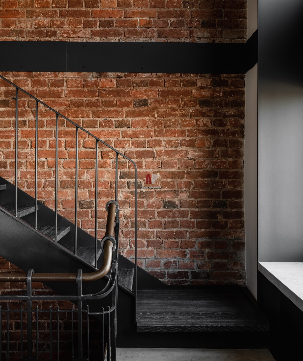 Легкая и внешне изящная лестница выполнена из металла под покраску с дубовыми ступенями. Кирпич в отделке стен – исторический.