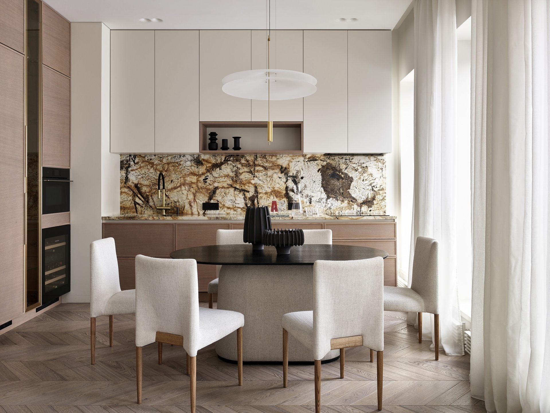Общая гостиная-столовая-кухня. Подвесные светильники, Vibia.