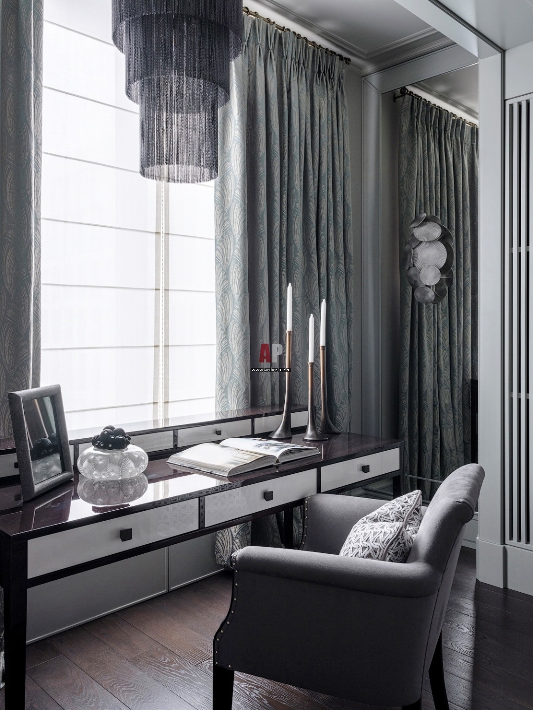Рабочая зона в одной из спален. Стол, Louise Bradley. Кресло, The Odd Chair Company. Ярусная люстра, Tigermoth Lighting. Бра, Porta Romana.