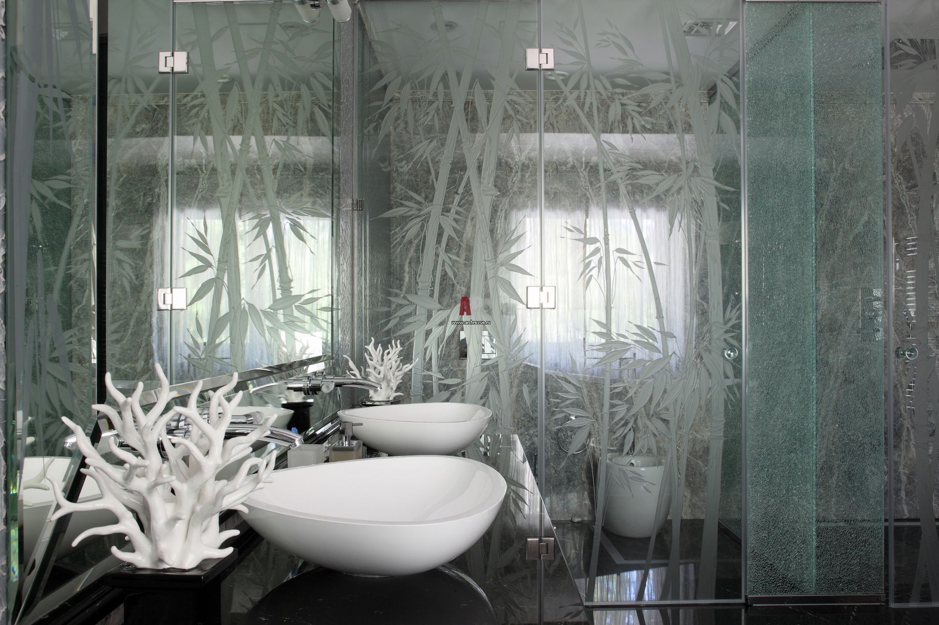Одна из ванных комнат похожа на хрустальный дворец. Она украшена витражами из прозрачного стекла, рисунок в виде бамбука выполнен методом глубокой гравировки.