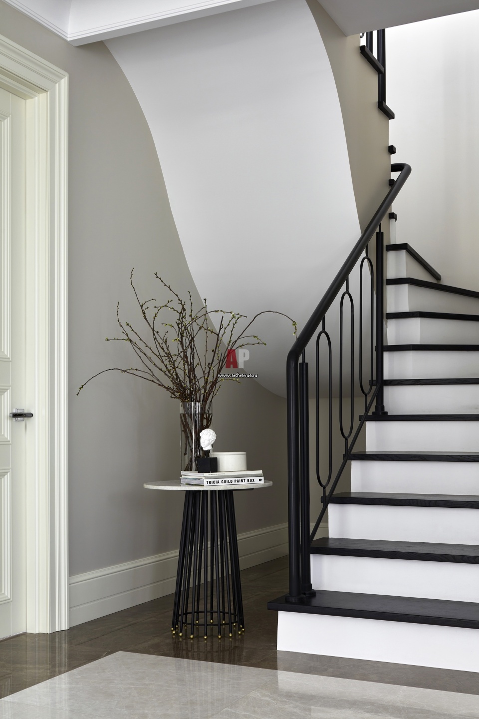 Двухэтажная квартира с традиционным декором. Лестница на второй этаж. Ограждения лестницы из черного металла выполнены по эскизу Дины Салаховой.