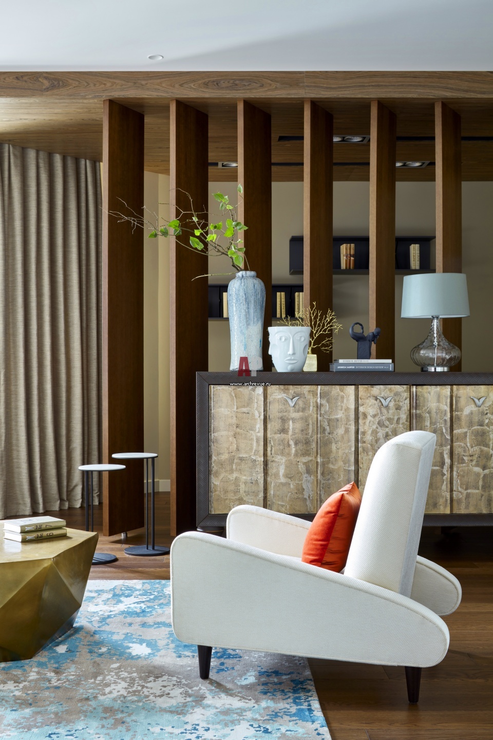 Интерьер гостиной. Комод с бронзовой патиной, Vittorio Grifoni. За ним находится перегородка-трансформер из дерева, которая отделяет рабочий кабинет хозяина. Кресла в обивке цвета айвори, винтаж.