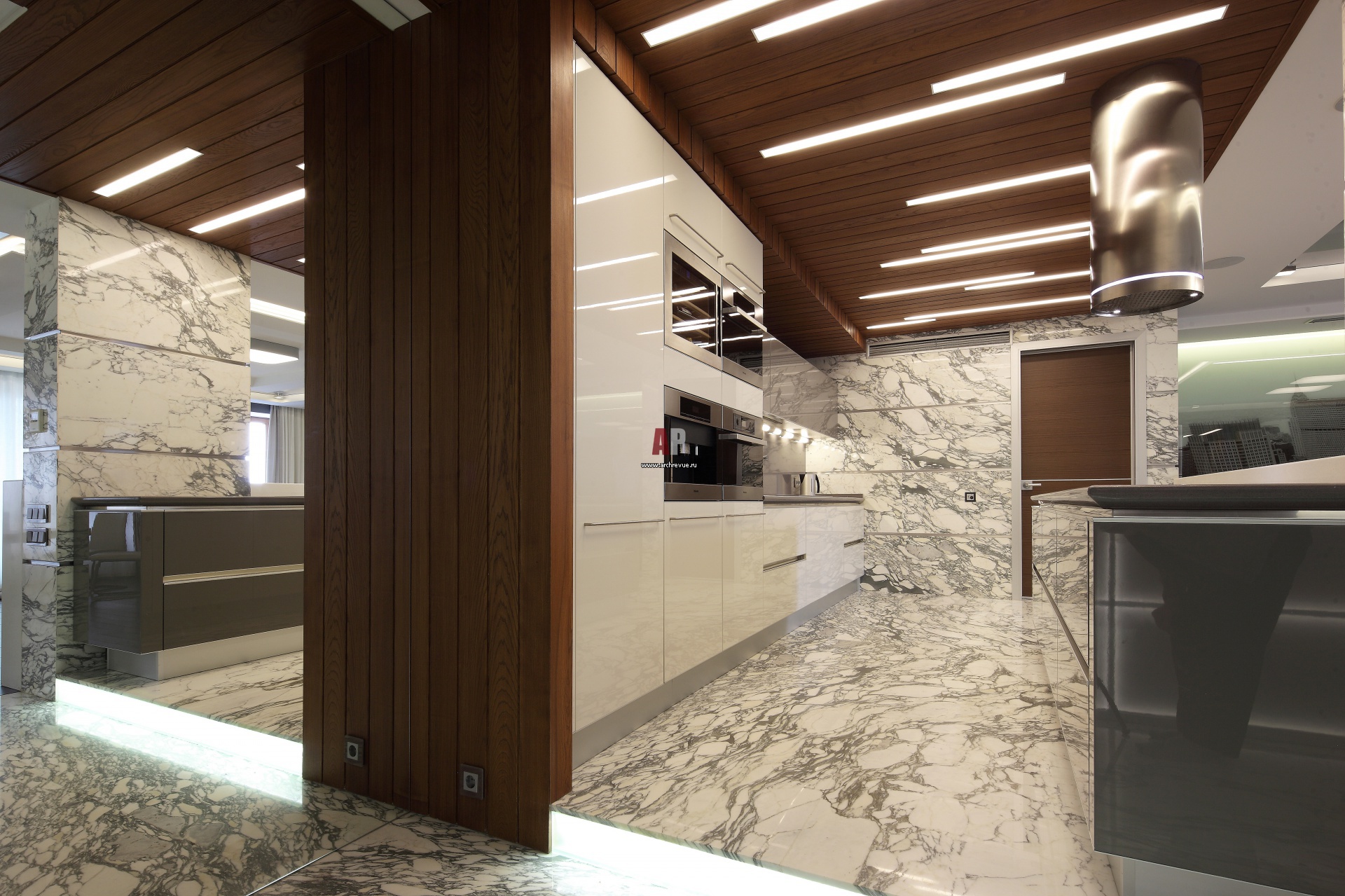 Кухня сострит из двух блоков – презентационного и рабочего. Оба поставлены на подиум, с торцов он подсвечен светодиодами.