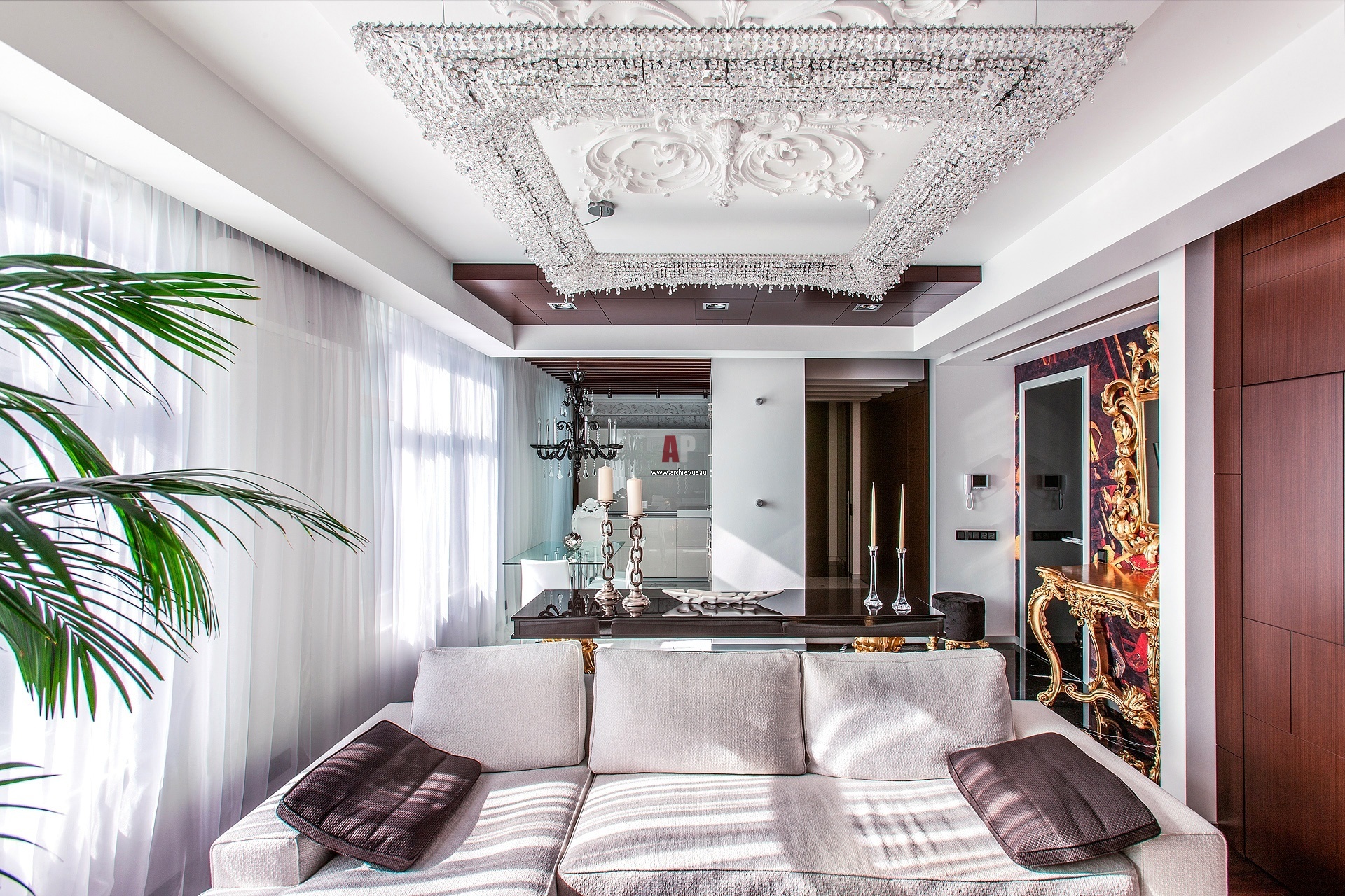 Общая часть квартиры представляет единый объем, в котором объединены прихожая, гостиная, столовая, кухня. Диван, Minotti. Пластику лепного плафона подчеркивает современный светильник.