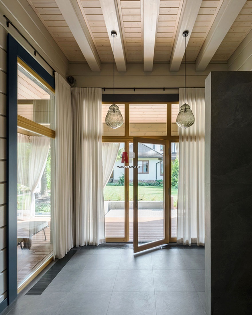 Деревянный гостевой дом в стиле современного шале. Входная группа со стеклянной дверью.