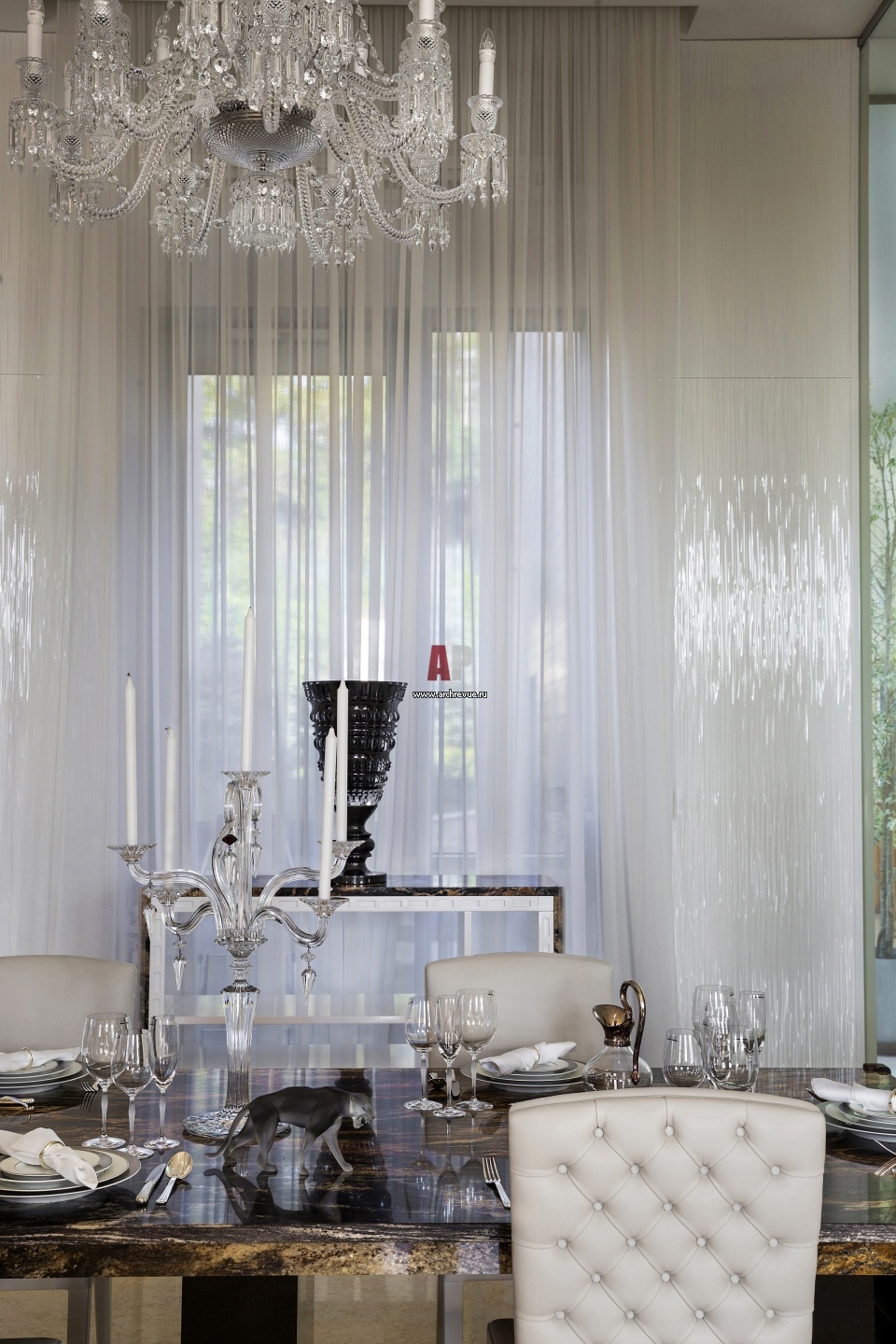 Парадная столовая в частном особняке. Обеденный стол выполнен по эскизам автора проекта, столешница каменная. Стулья, Visionnaire. Люстра, Baccarat.