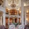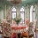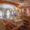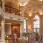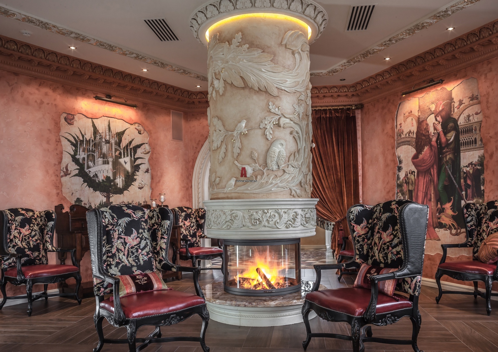Дымоход панорамного камина украшен лепным декором с цветочными мотивами. На стенах – фрески по сюжету рыцарских турниров.